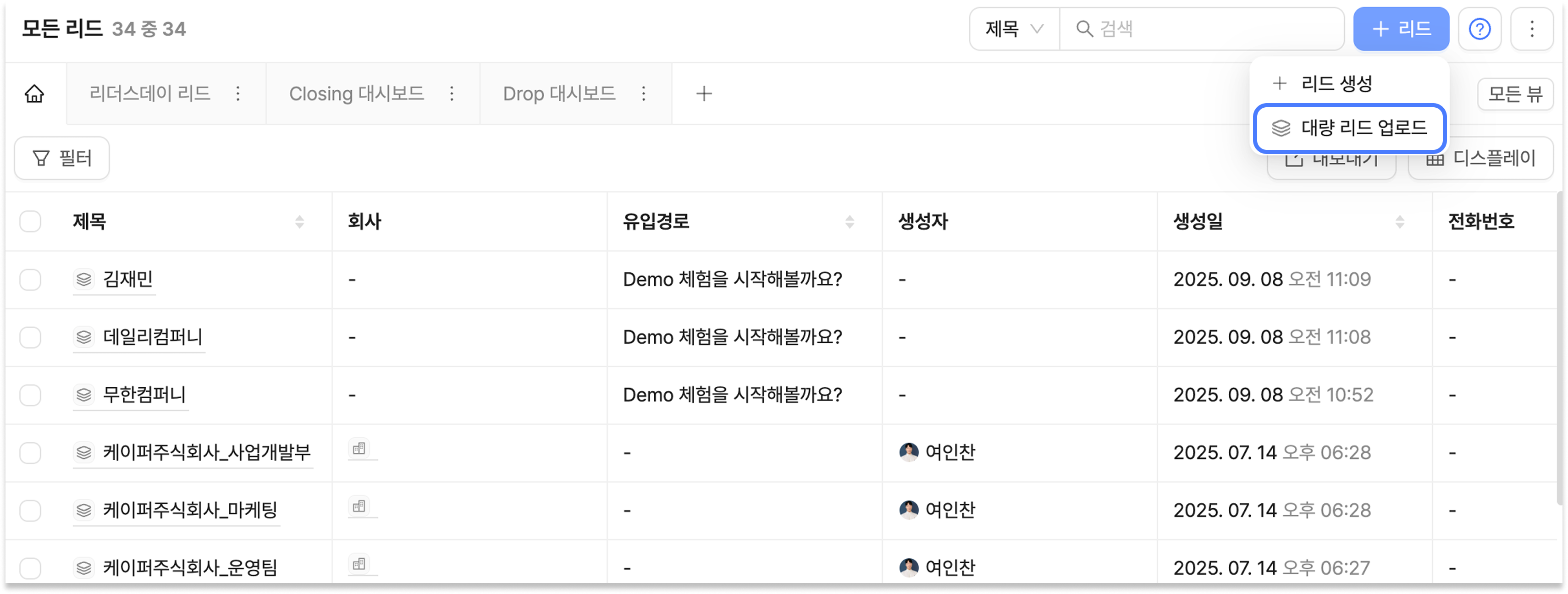 데이터 정리가 완료되었다면, 리드 또는 딜 메뉴에서 ‘+ 리드’ - ‘리드 대량 업로드’ 를 클릭합니다.
