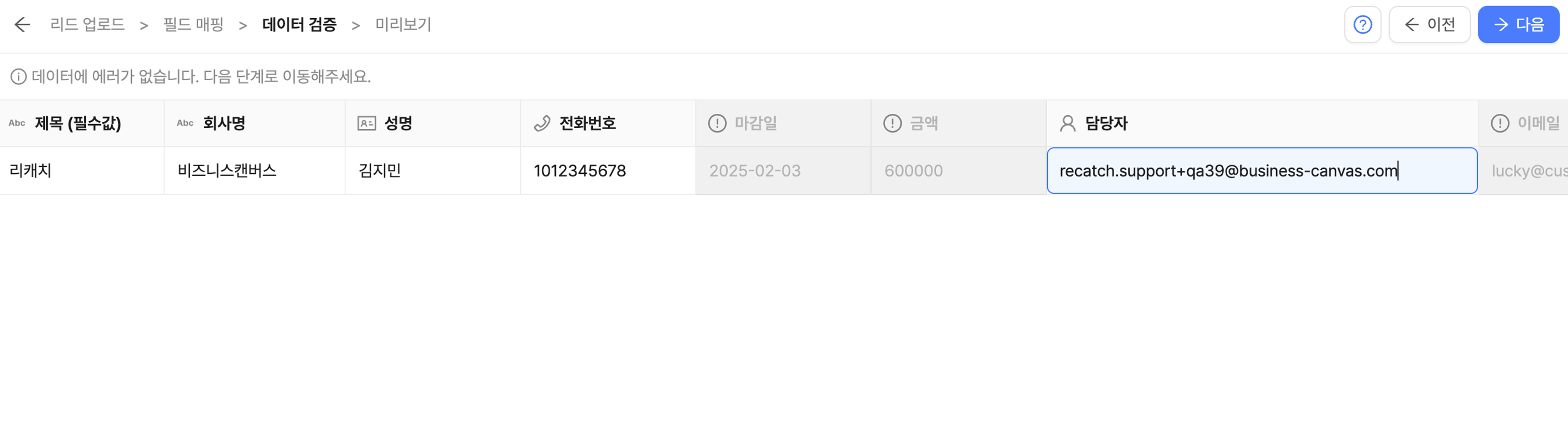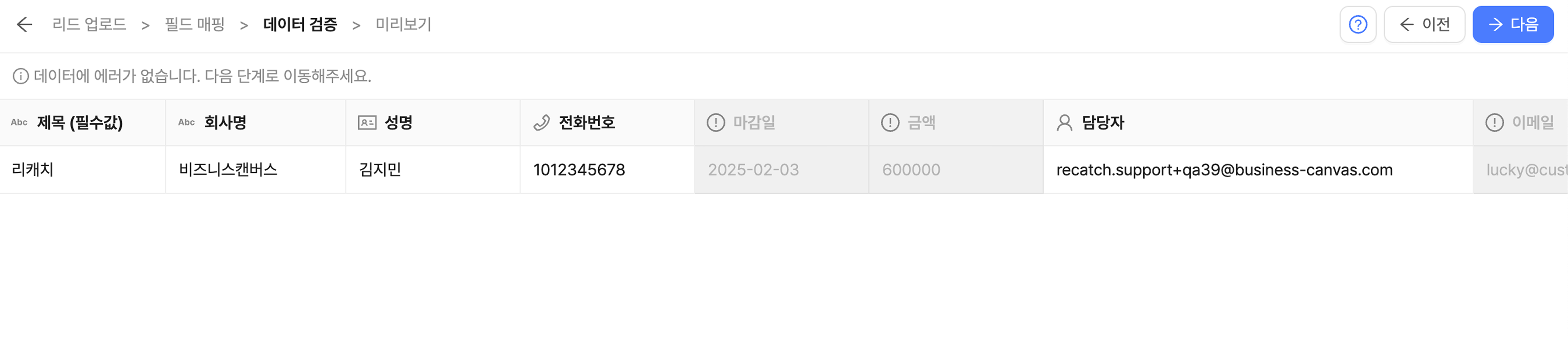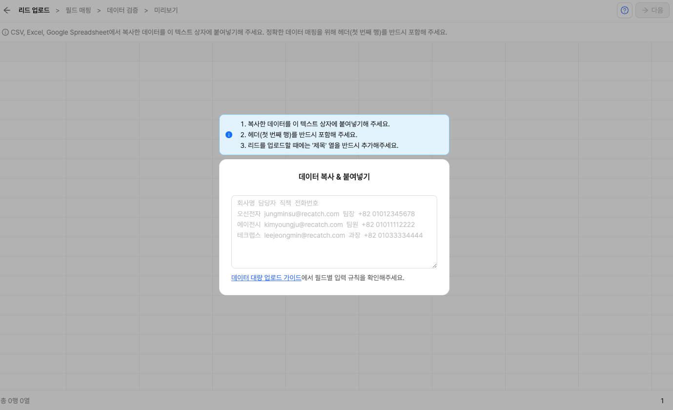 필드를 매핑합니다. 복사한 데이터의 각 열(Column)이 리캐치의 어떤 필드에 해당하는지 지정하는 과정입니다.
