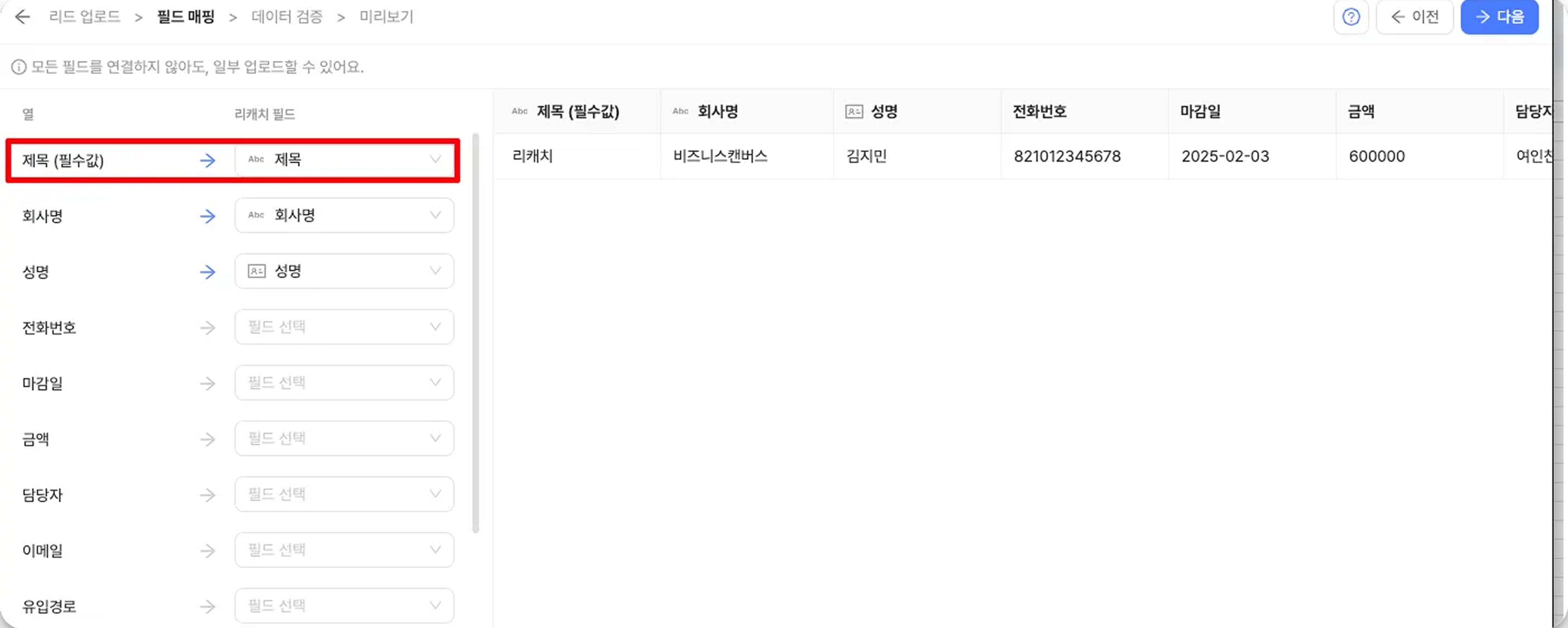 리캐치의 '회사'와 '연락처' 필드로 업로드를 하려는 경우
