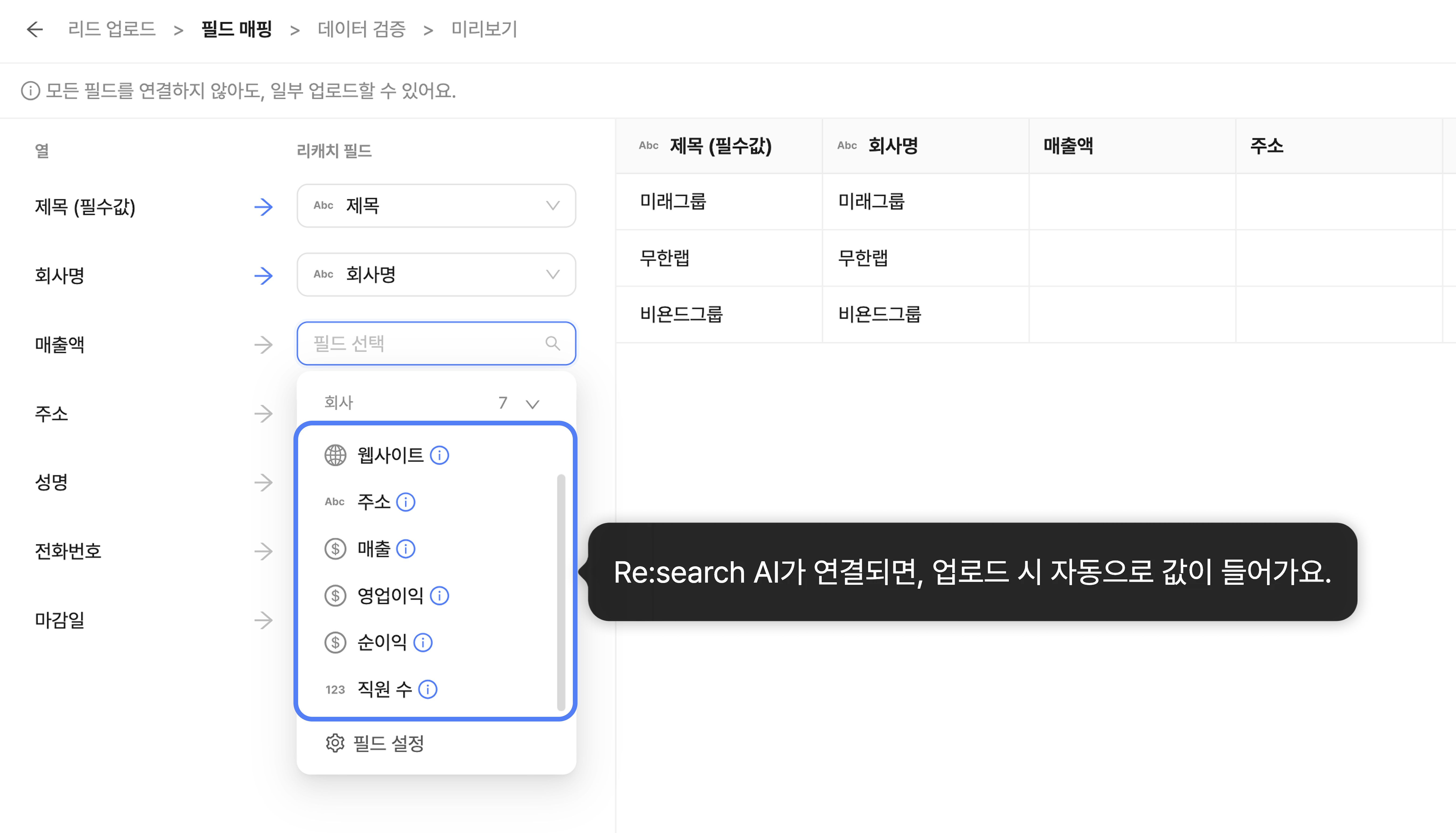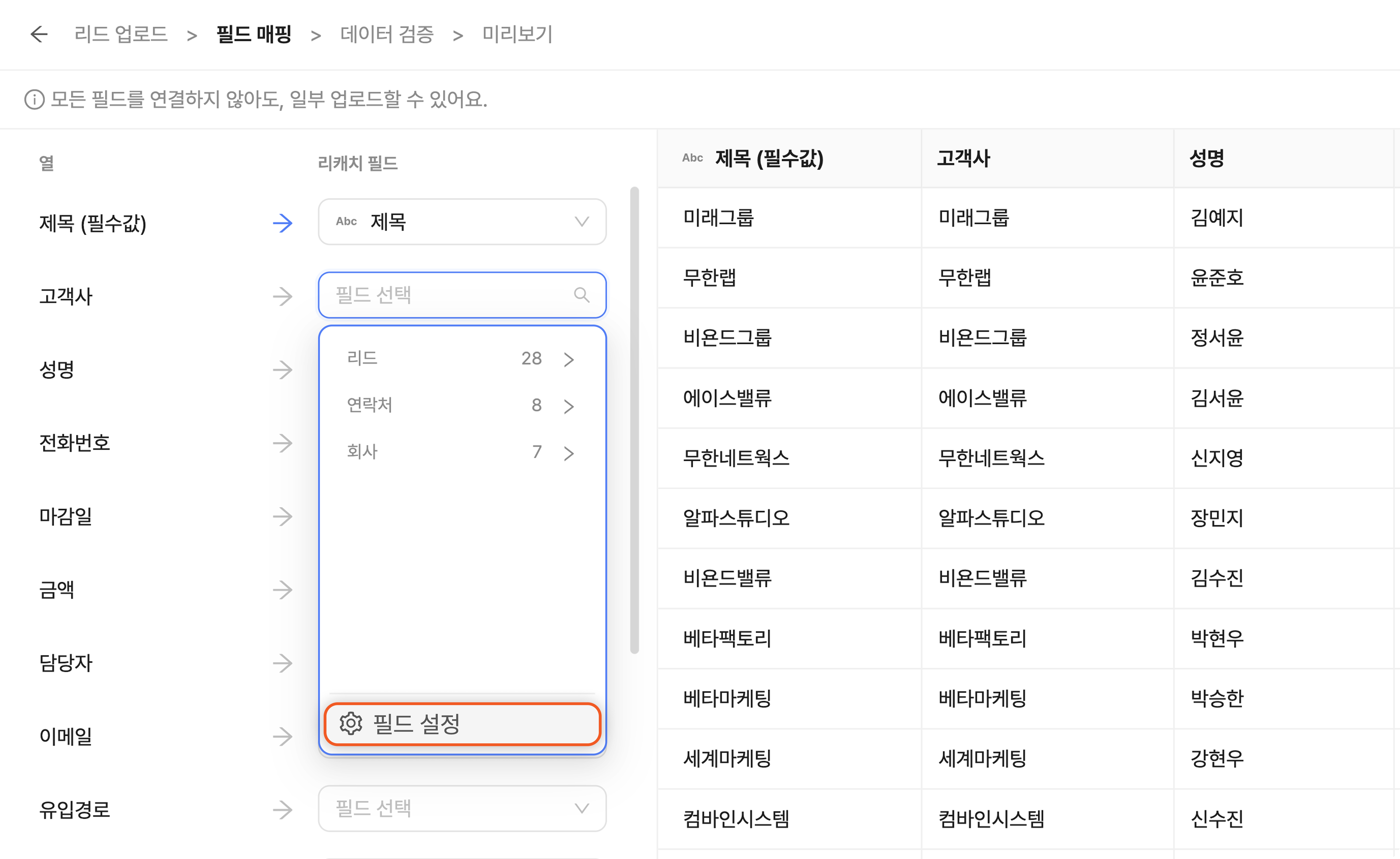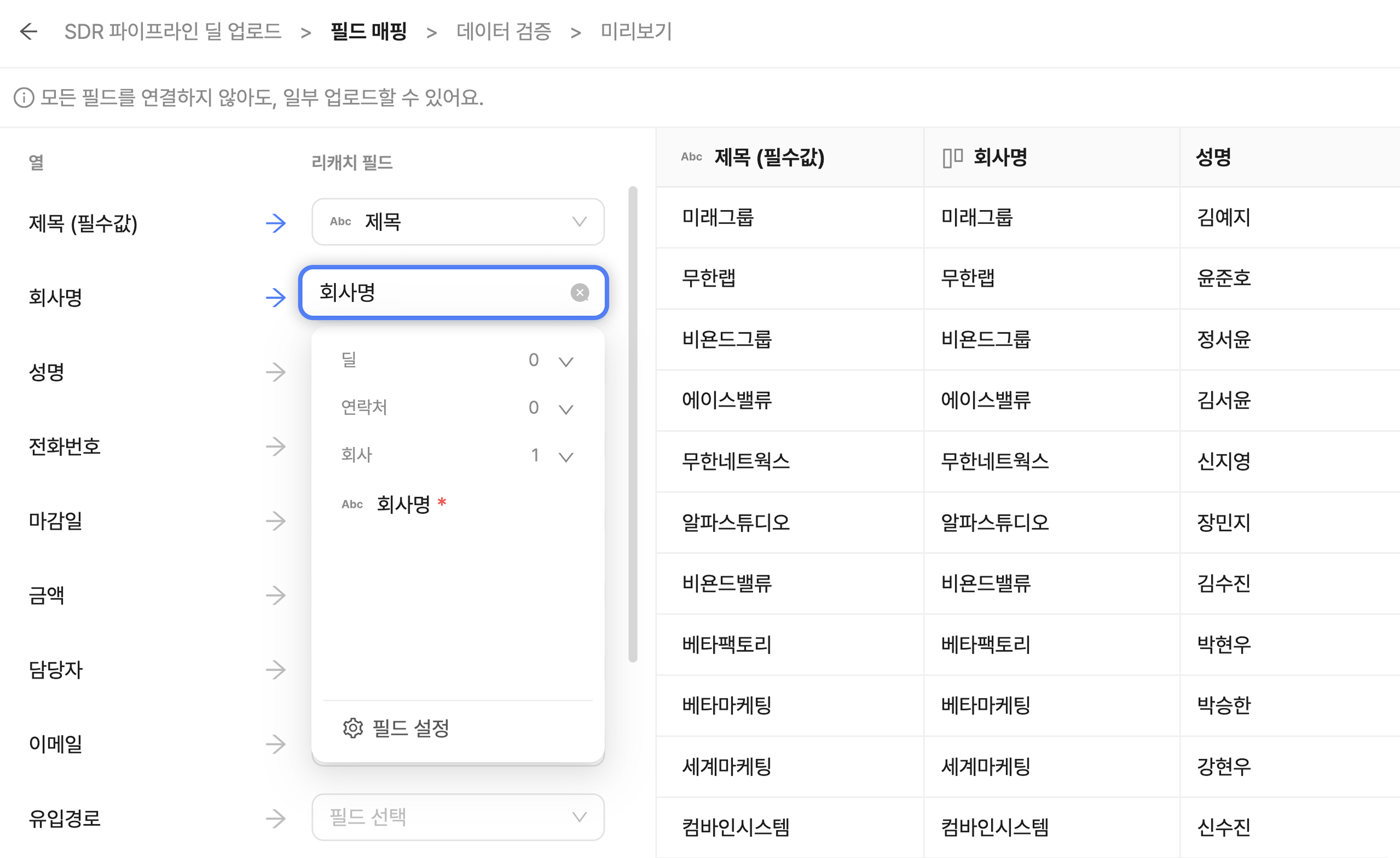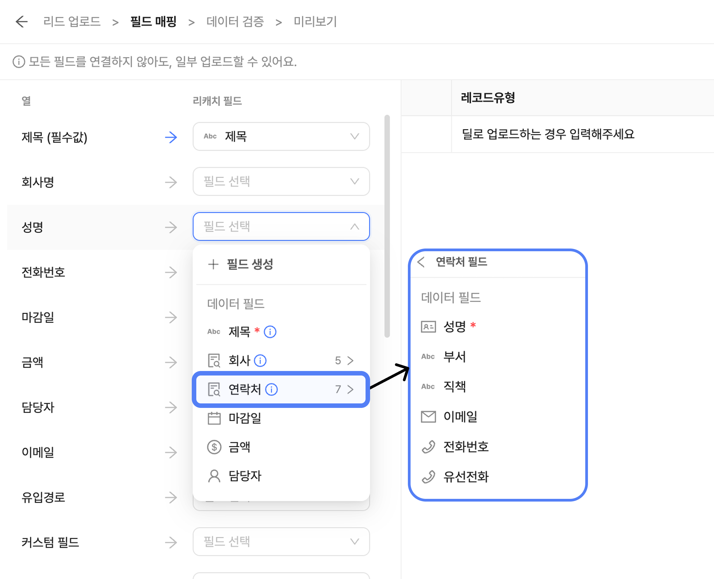 만약 회사 웹사이트, 담당자 직책 등 회사나 연락처에 속한 정보를 업로드하려면, 필드 선택 시 '회사' 또는 '연락처'를 먼저 클릭한 후 해당하는 필드를 선택해야 합니다.