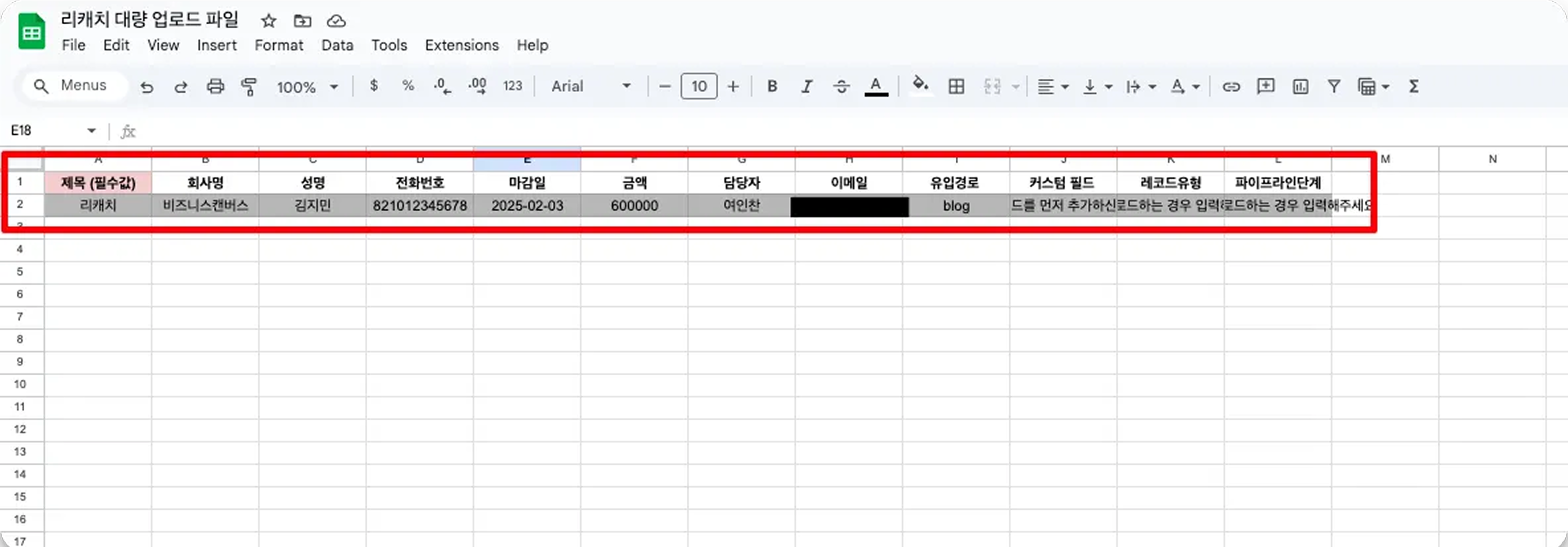 샘플 파일 활용: 원활한 업로드를 위해, 제공되는 리캐치 대량 업로드 샘플 파일 형식에 맞춰 데이터를 정리해 주세요.