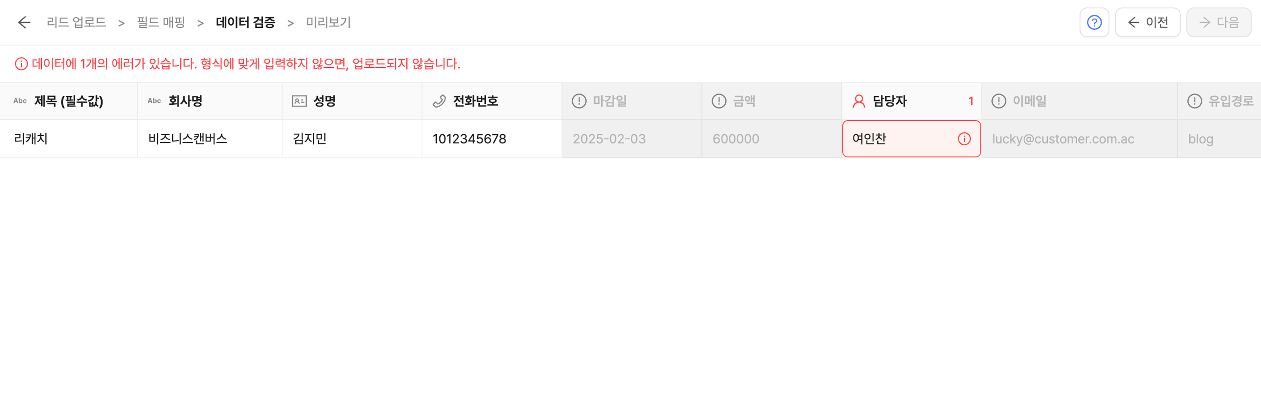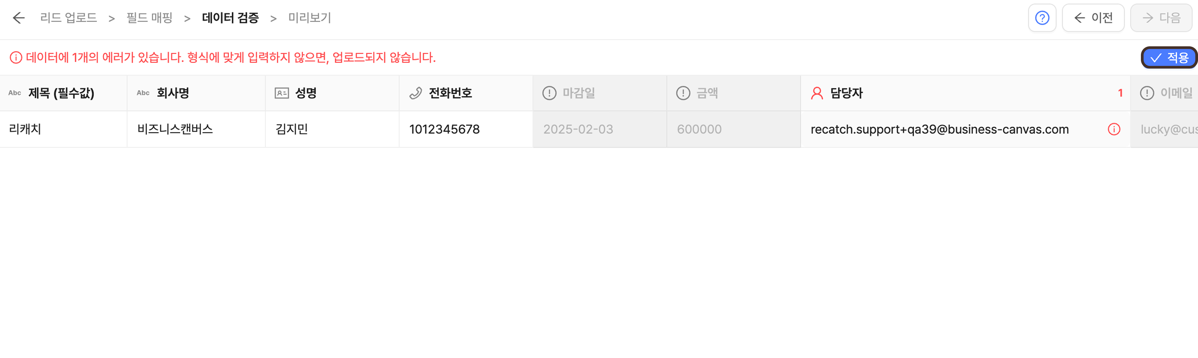 아래 예시 이미지에서는 담당자가 이메일 형식이 아닌 텍스트로 입력되어 에러가 발생했습니다.