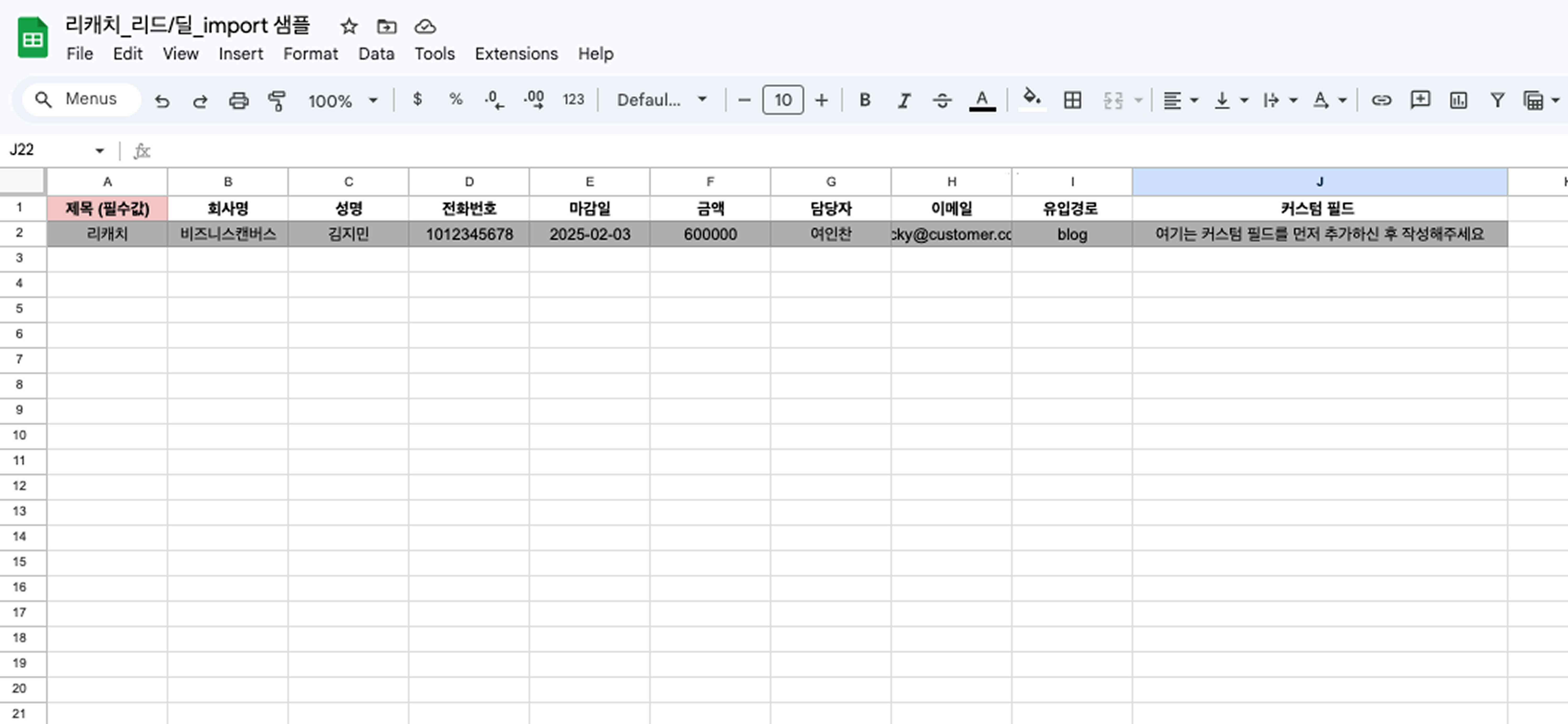 데이터 생성 방식: 엑셀 파일의 한 줄(행)은 하나의 리드(또는 딜) 데이터가 됩니다. 만약 그 줄에 회사와 연락처 정보가 함께 있다면, 리드(딜) 데이터에 연결된 회사와 연락처 데이터도 함께 생성됩니다.