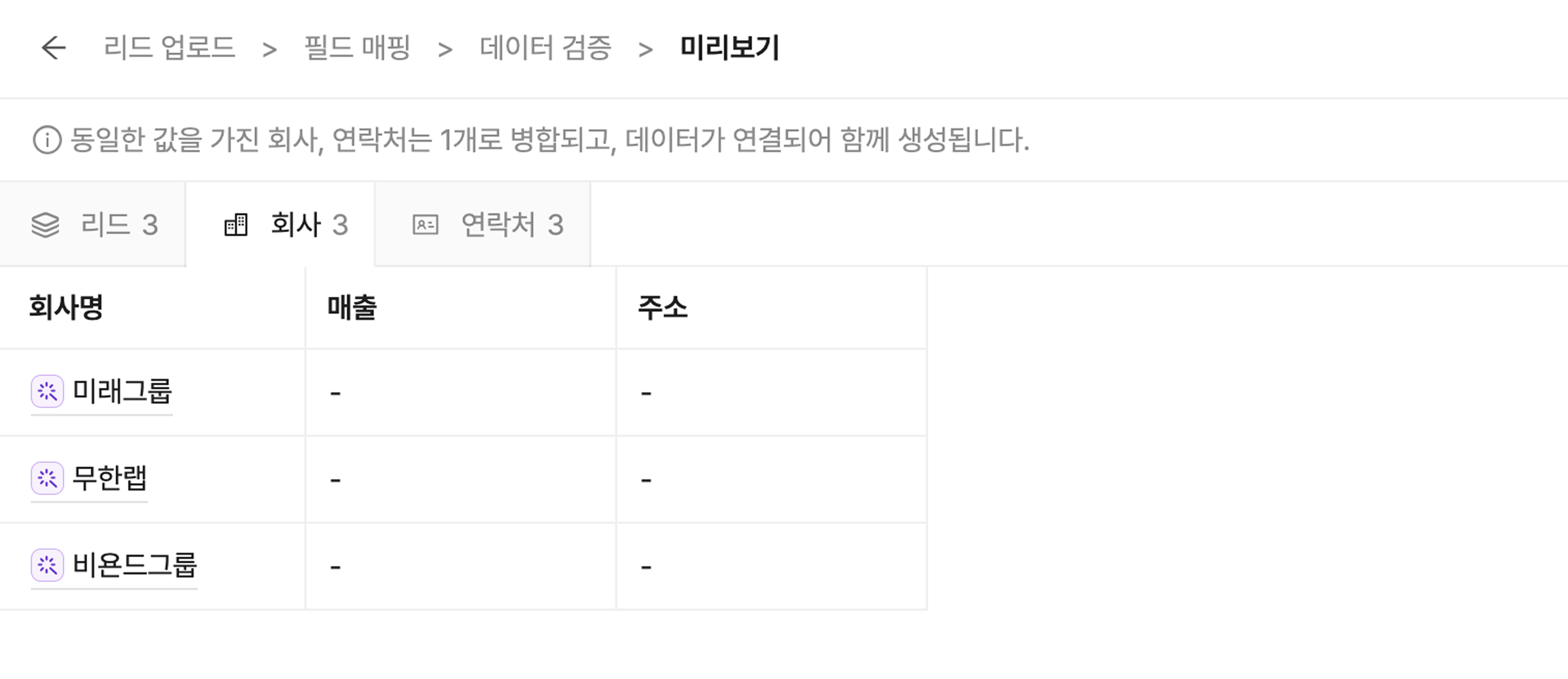 업로드하는 파일 내에 동일한 회사명이나 연락처가 존재하더라도, 각 줄을 별개의 데이터로 인식하여 모두 새로운 레코드로 생성합니다.