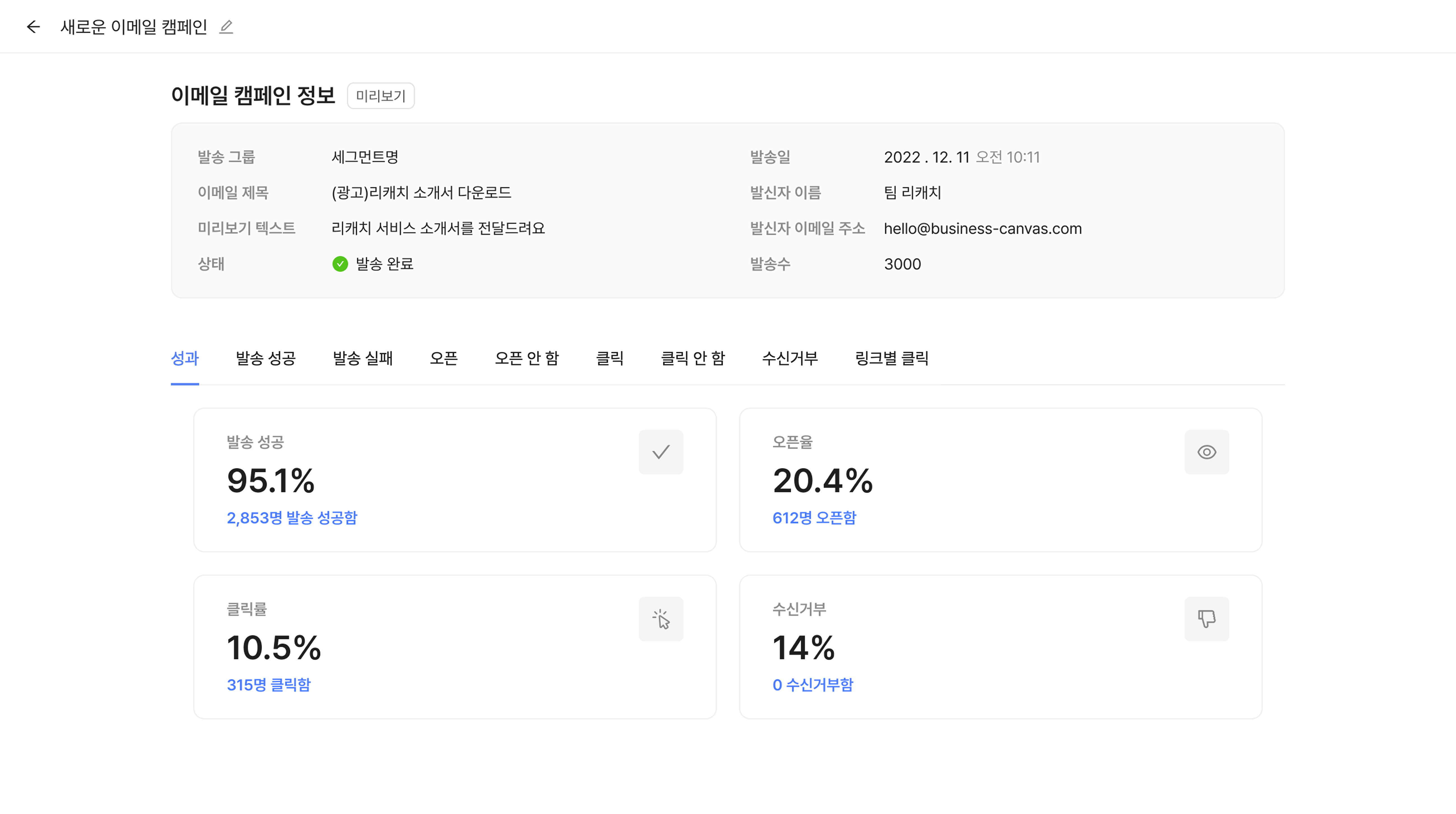 성과에서는 발송 성공, 오픈율, 클릭률, 수신 거부를 확인할 수 있으며 '발송 성공', '발송 실패', '오픈', '오픈 안 함', '클릭', '클릭 안 함', '수신거부', '링크별 클릭'을 클릭하면 더 자세한 정보를 확인할 수 있습니다.