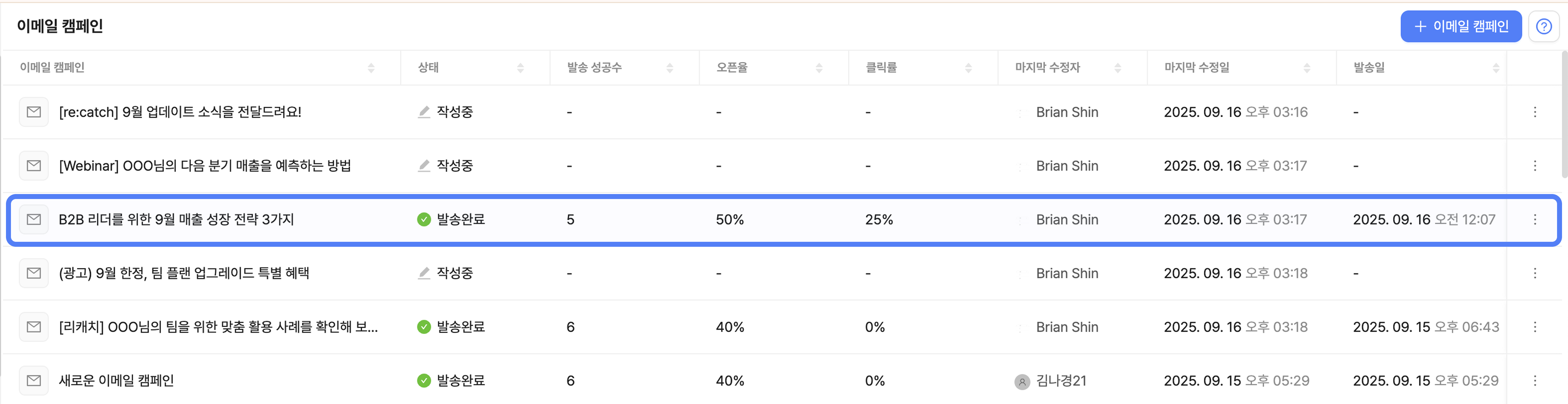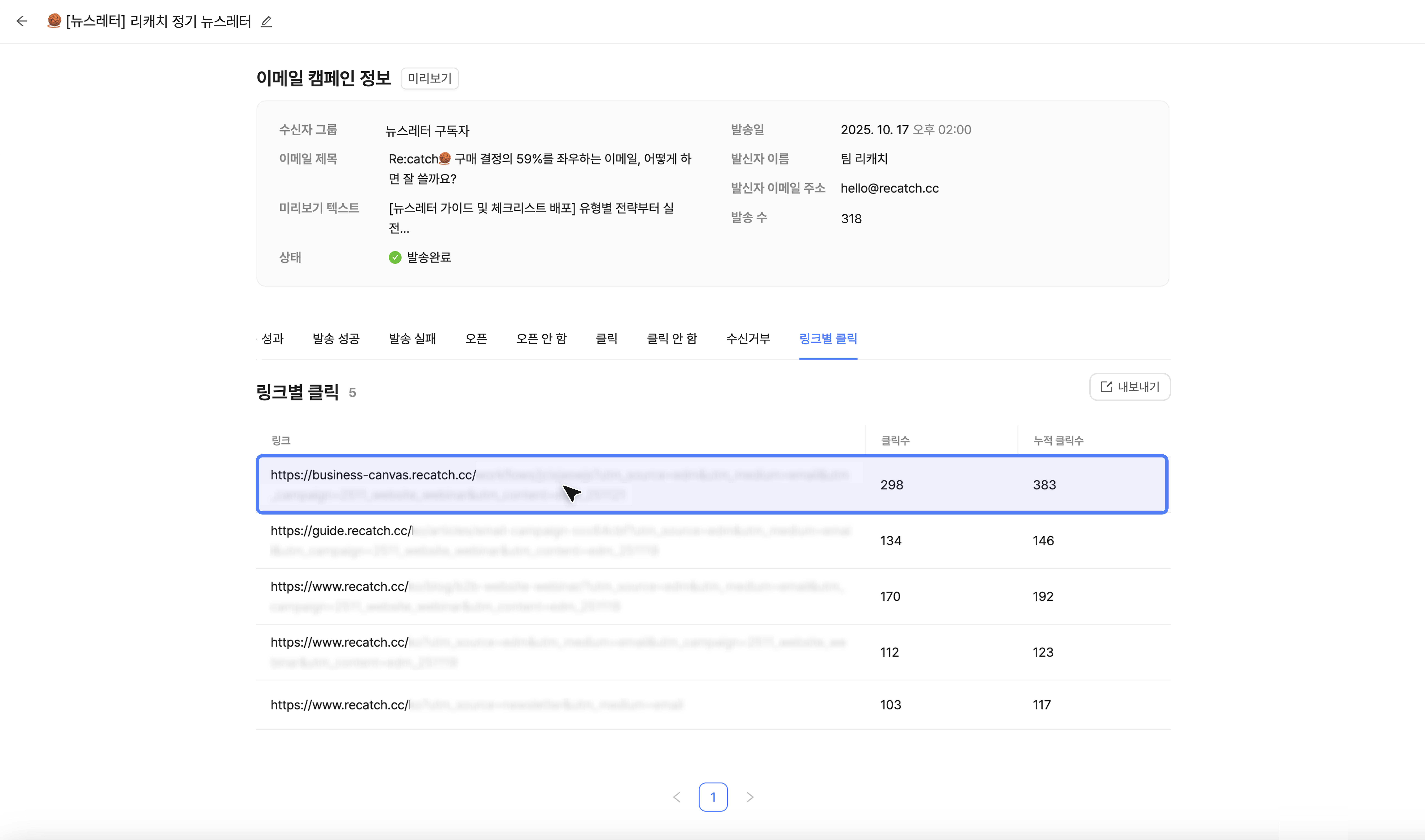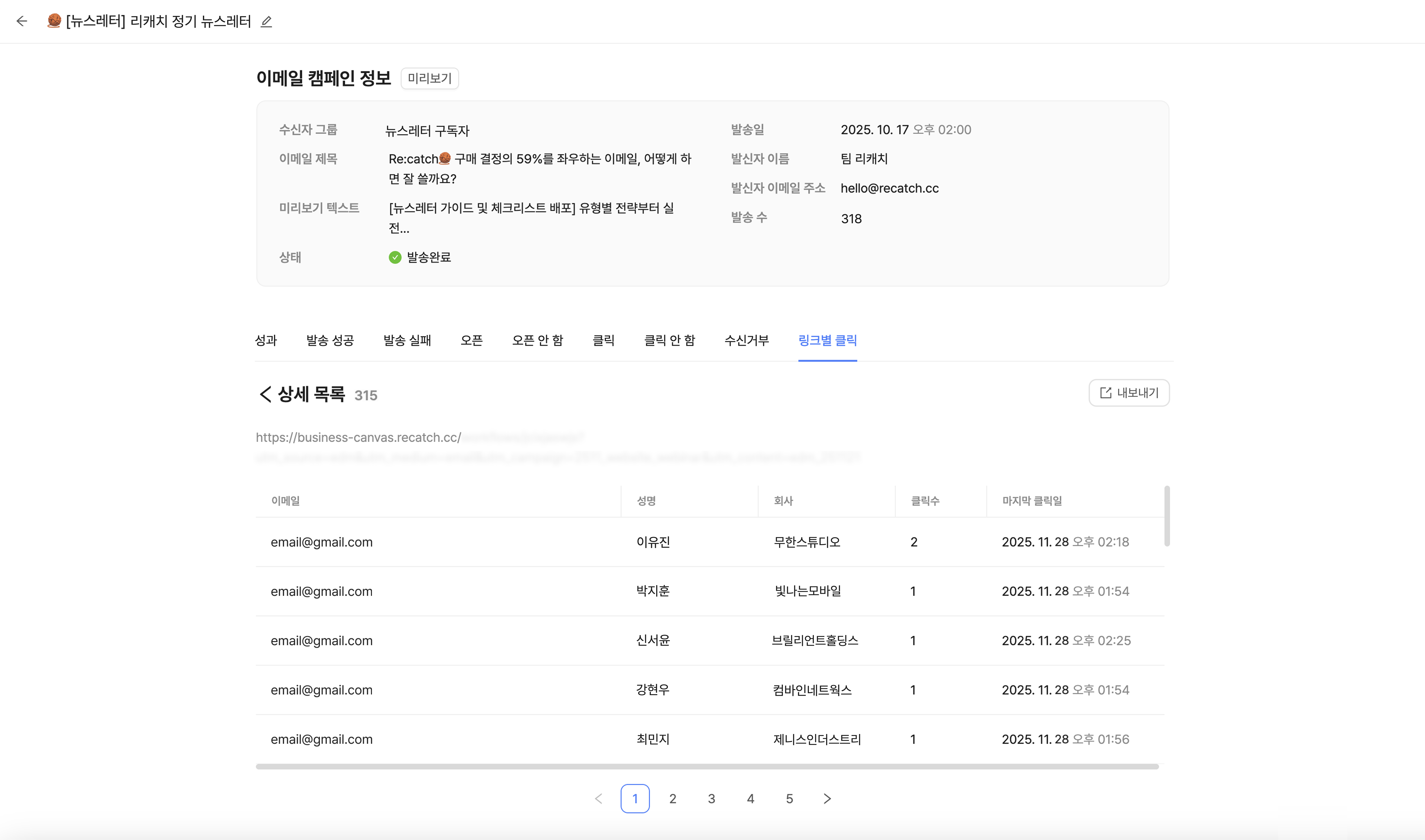 이메일 캠페인에서 '발송완료' 한 캠페인을 클릭하면 발송 결과를 확인할 수 있습니다.