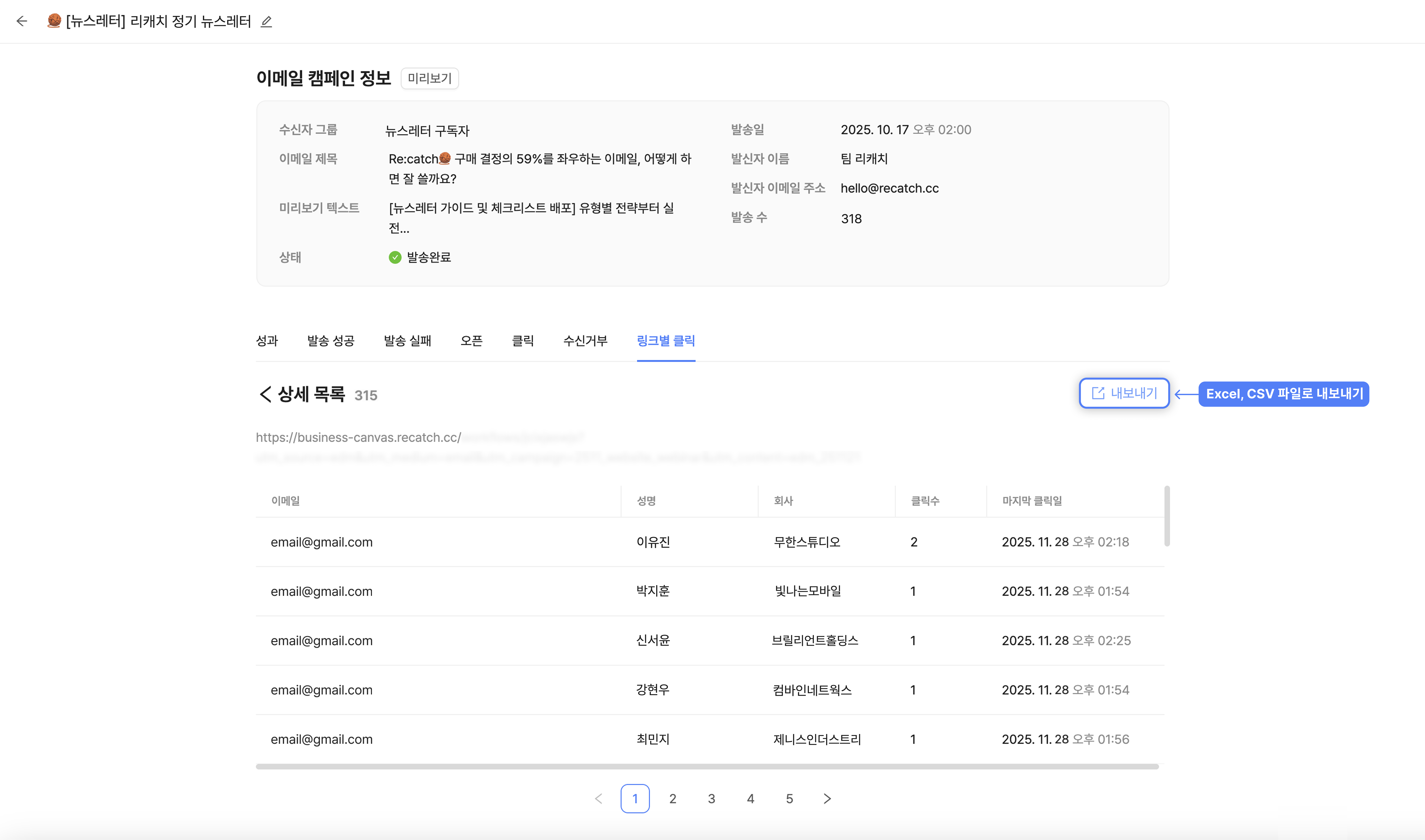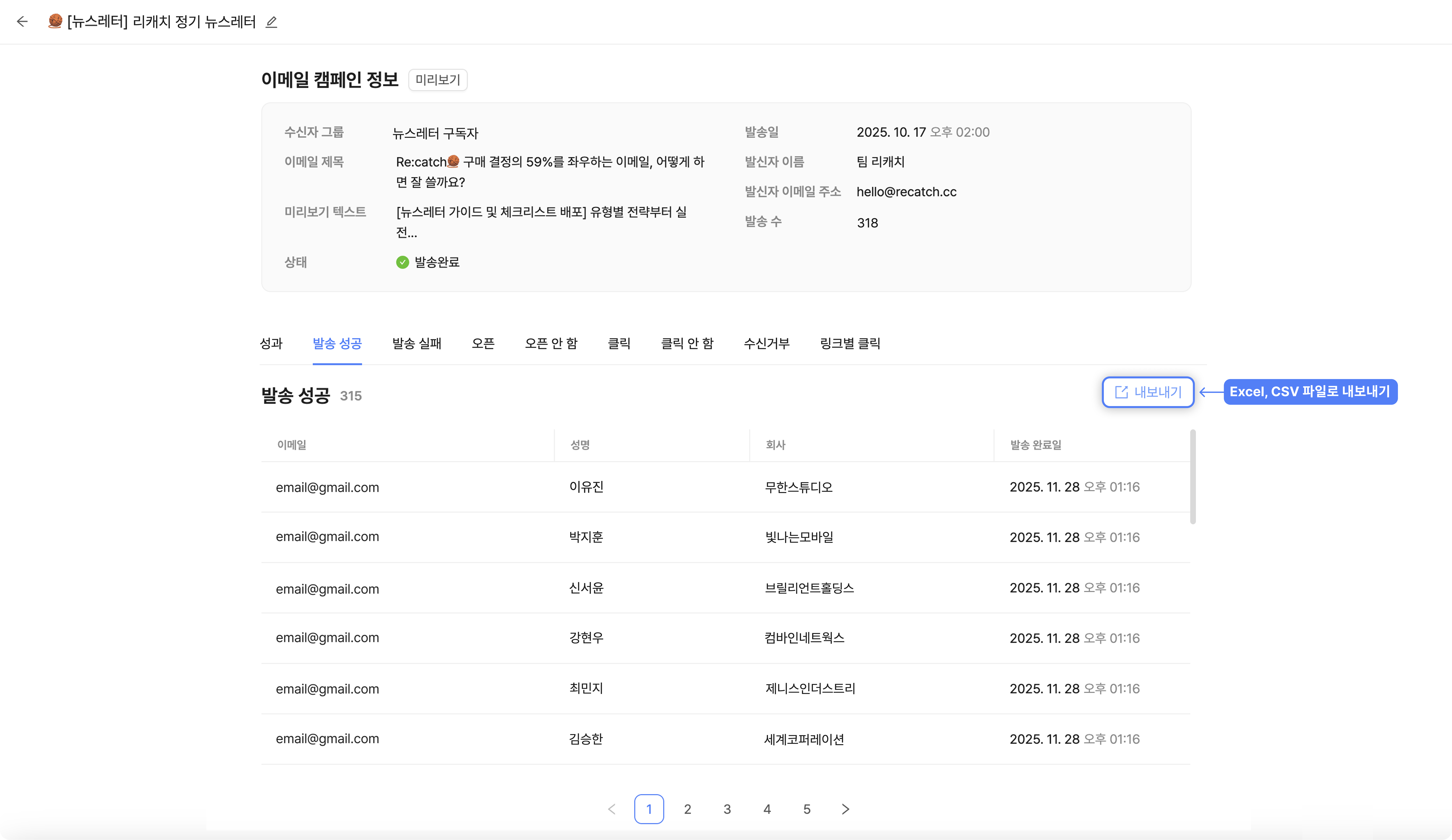 또한 우측의 '내보내기'를 클릭하면 해당 발송 결과를 Excel이나 CSV 파일로 받아볼 수 있습니다.