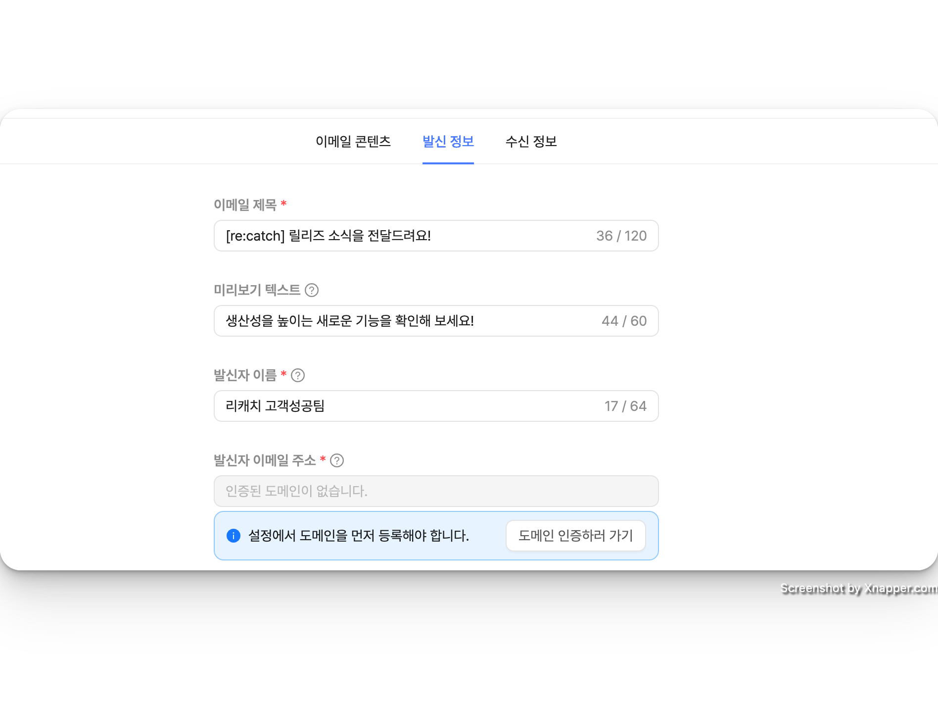 발신 정보에서는 이메일 제목, 미리보기 텍스트, 발신자 이름과 발신자 이메일 주소를 설정할 수 있습니다.