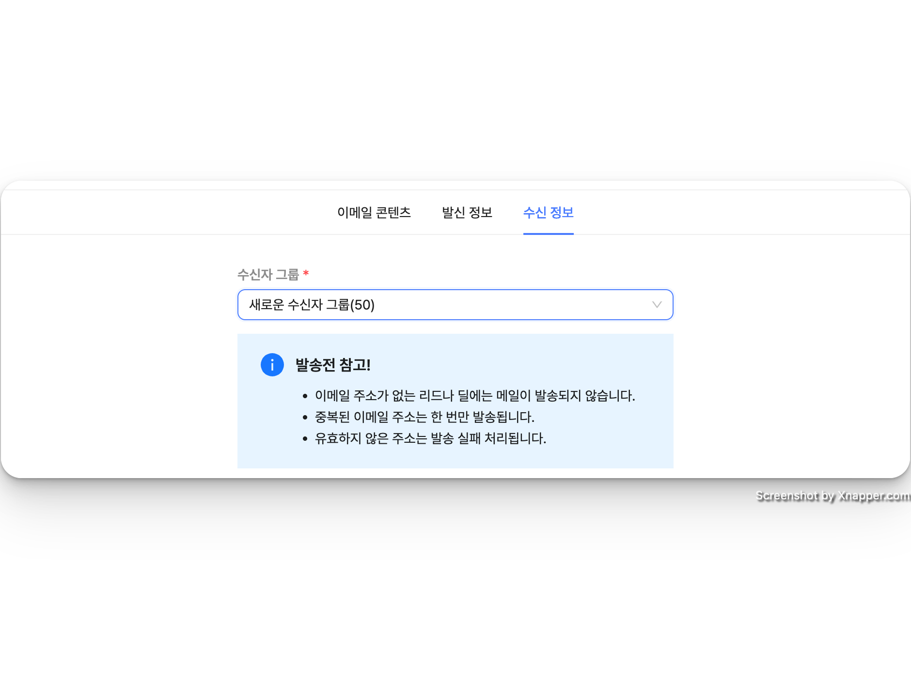 수신 정보에서는 이메일을 전송할 수신자 그룹을 선택할 수 있어요.