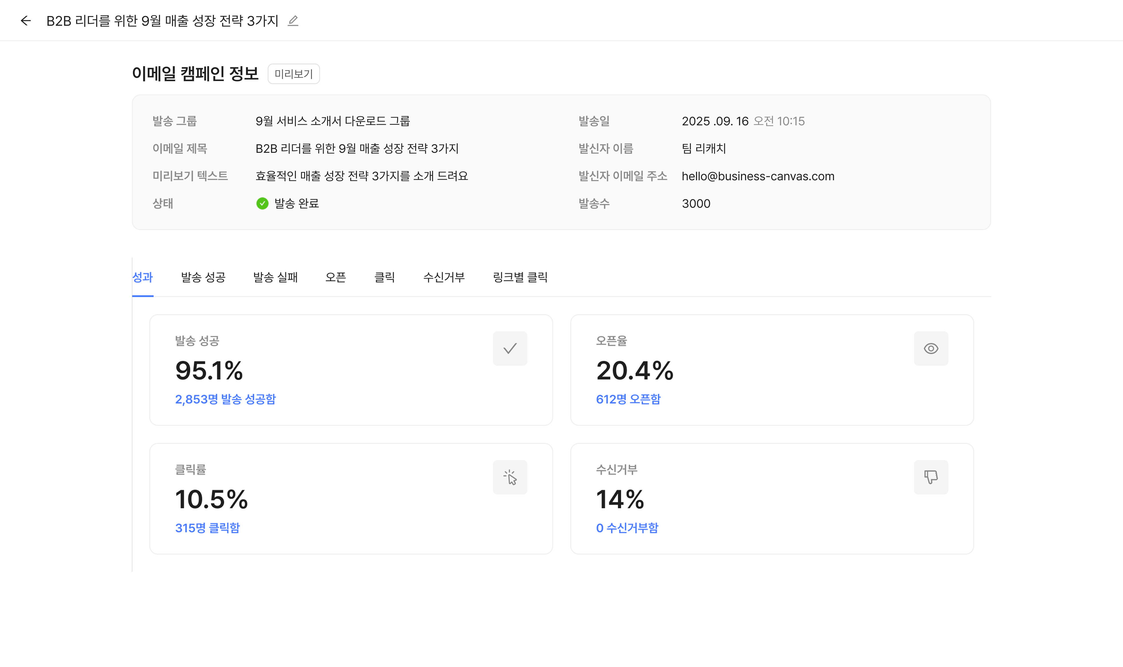 성과에서는 발송 성공, 오픈율, 클릭률, 수신 거부를 확인할 수 있으며 '발송 성공', '발송 실패', '오픈', '클릭', '수신거부', '링크별 클릭'을 클릭하면 더 자세한 정보를 확인할 수 있습니다.