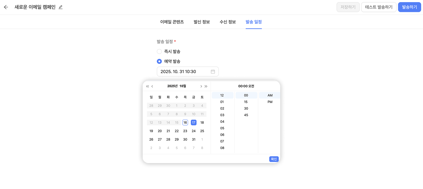 발송 일정은 즉시 발송 또는 예약 발송 중 선택할 수 있습니다.