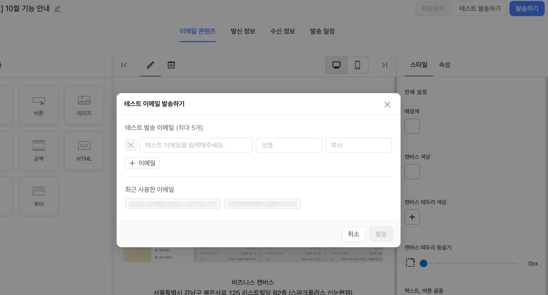 우측 상단의 '테스트 발송하기' 를 클릭하여 테스트 발송을 진행할 이메일을 입력하여 테스트를 진행할 수 있습니다.