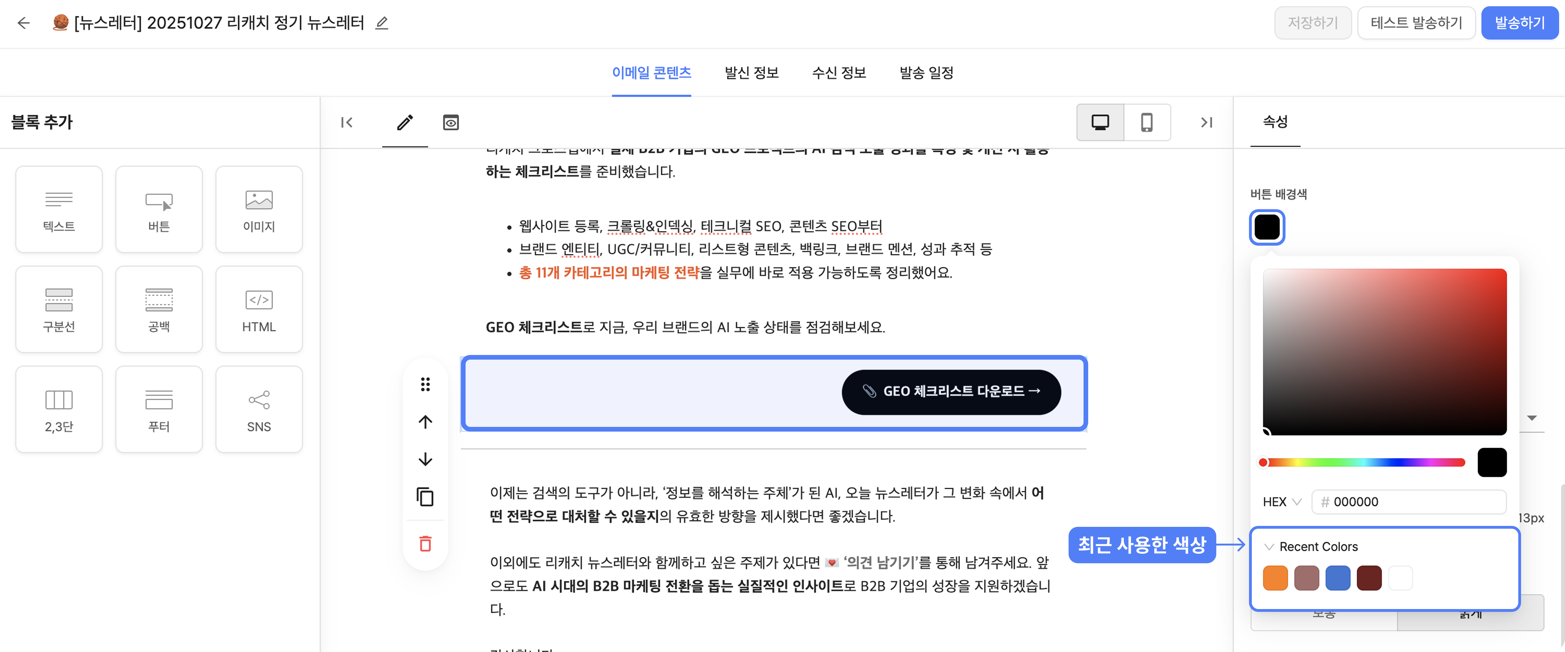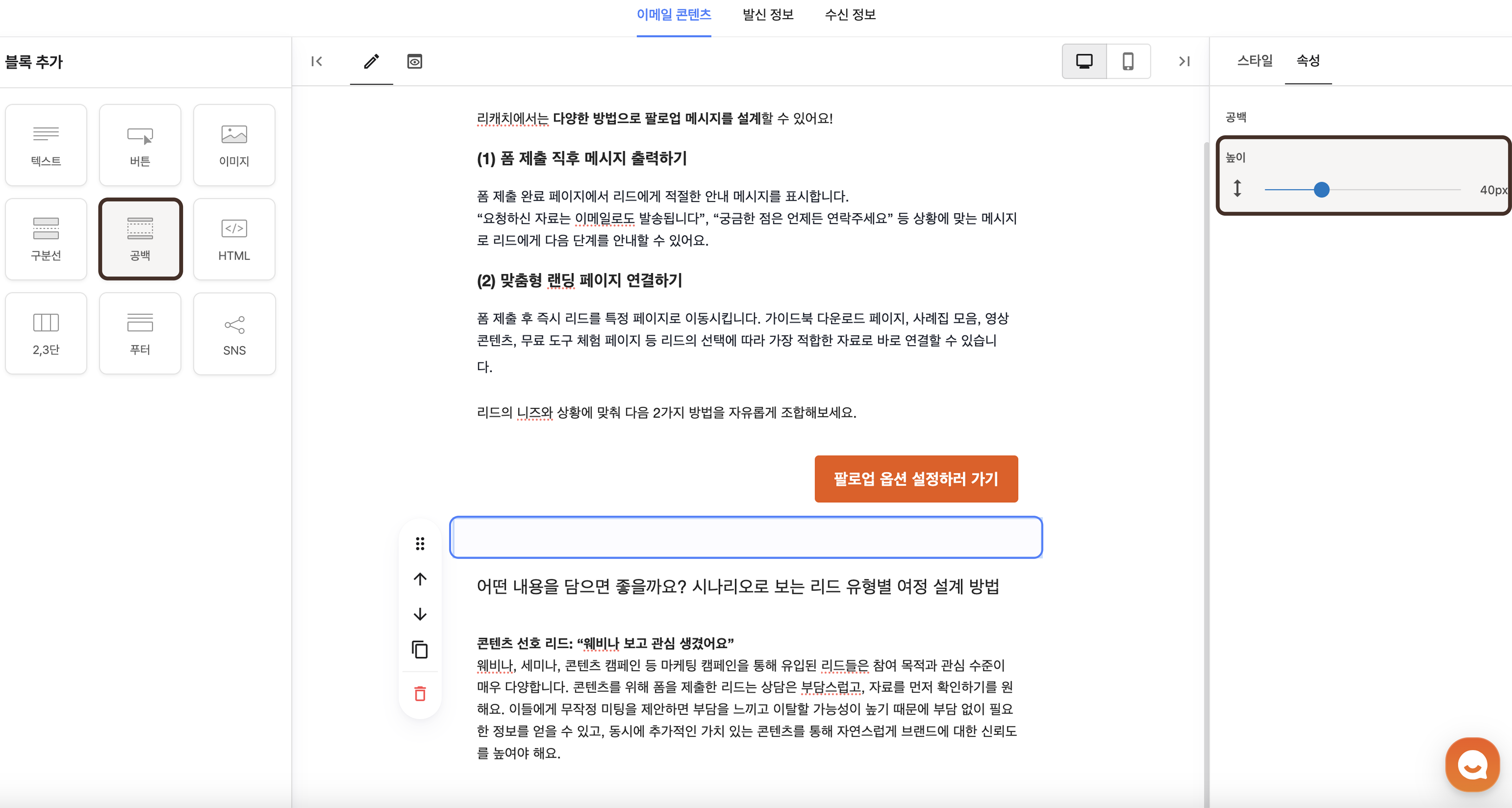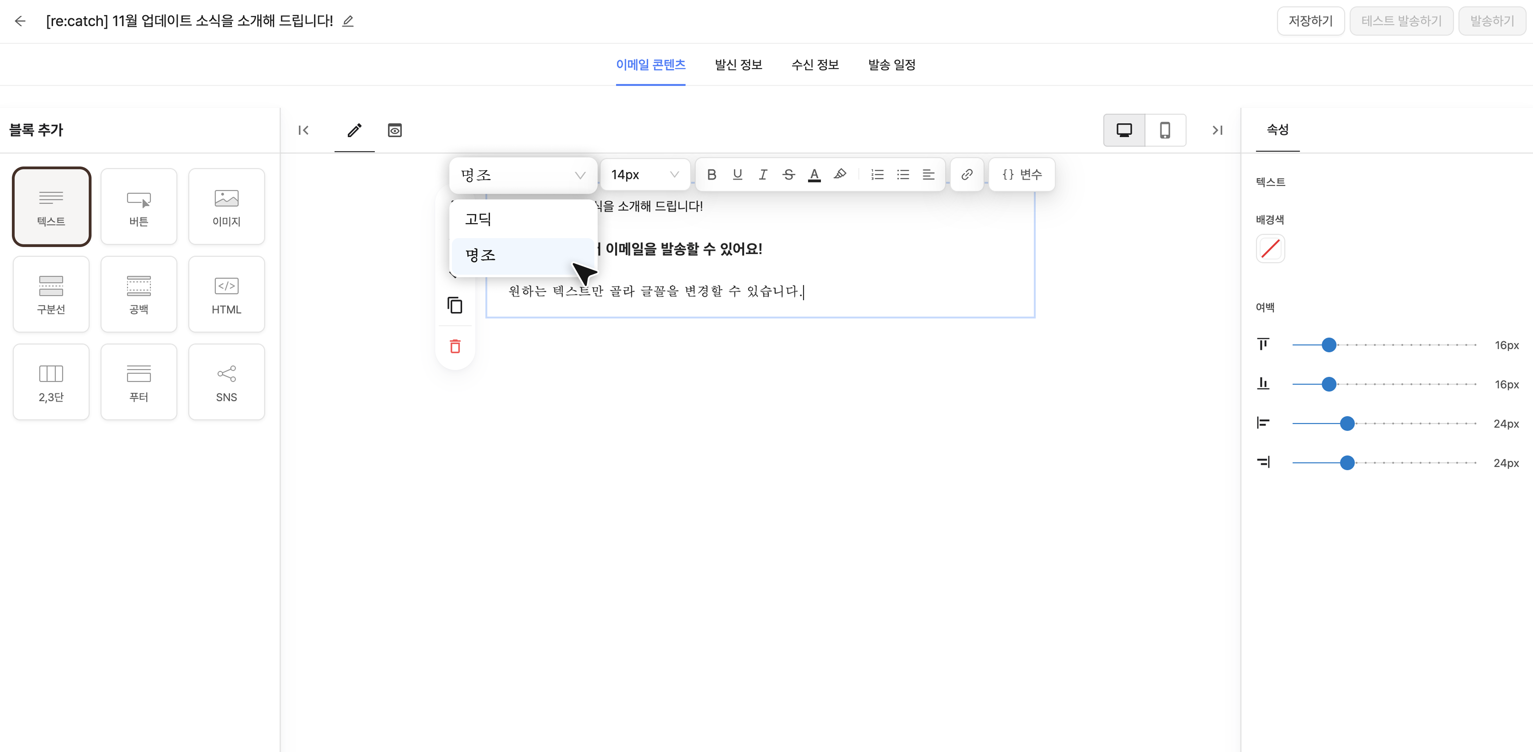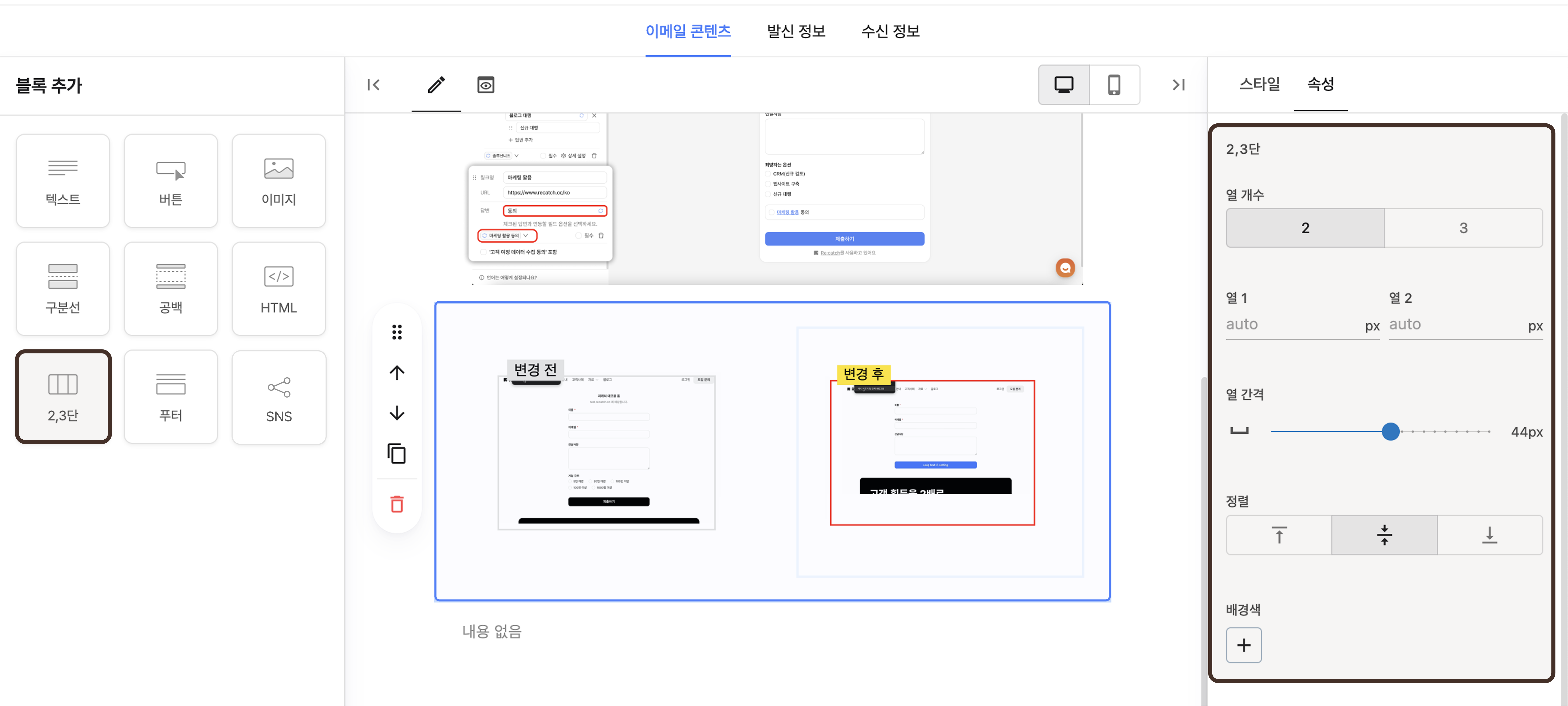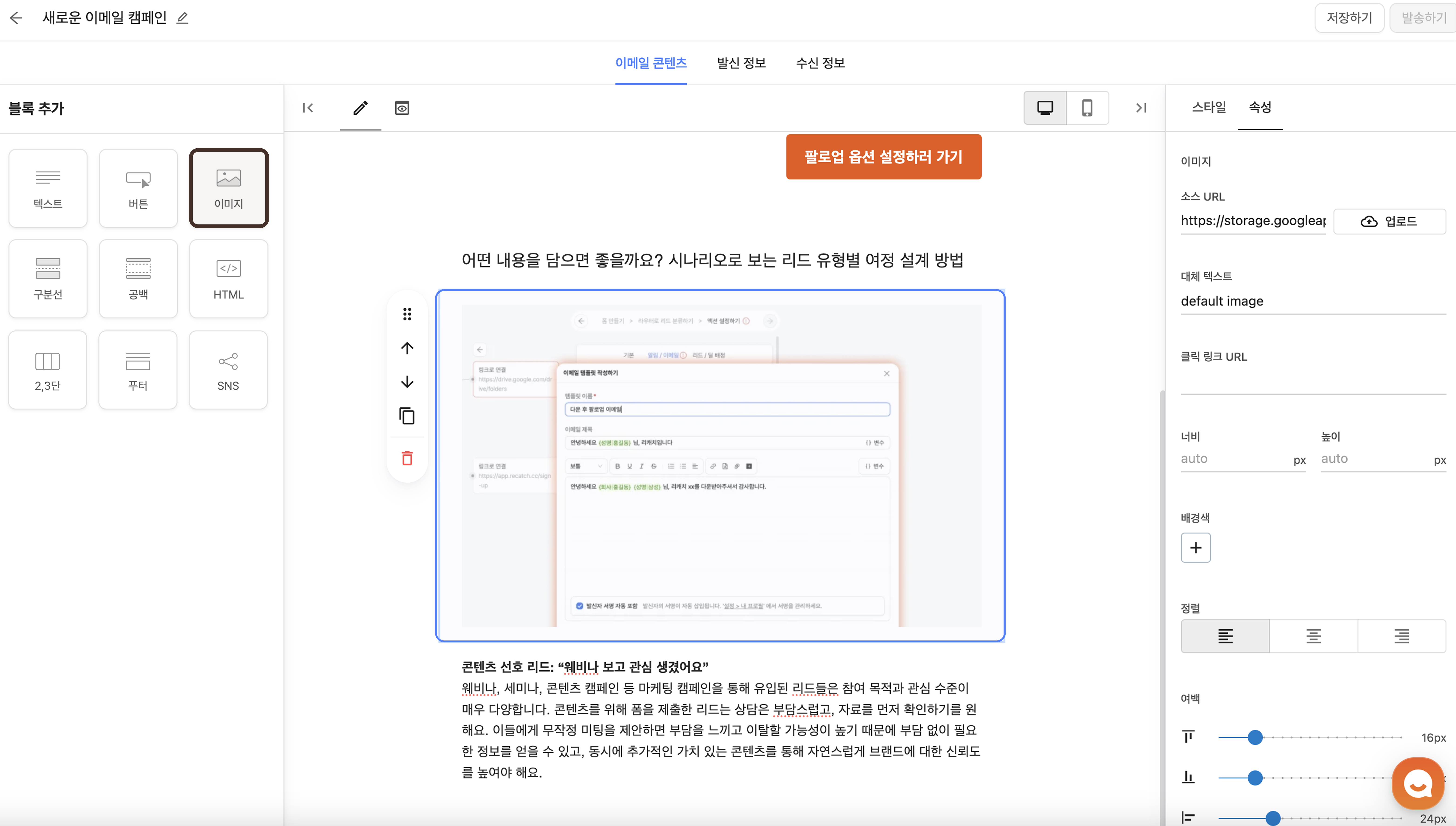 이메일 콘텐츠 탭에서는 텍스트, 이미지, 버튼 등 다양한 블록을 활용하여 손쉽게 원하는 콘텐츠를 작성할 수 있습니다.