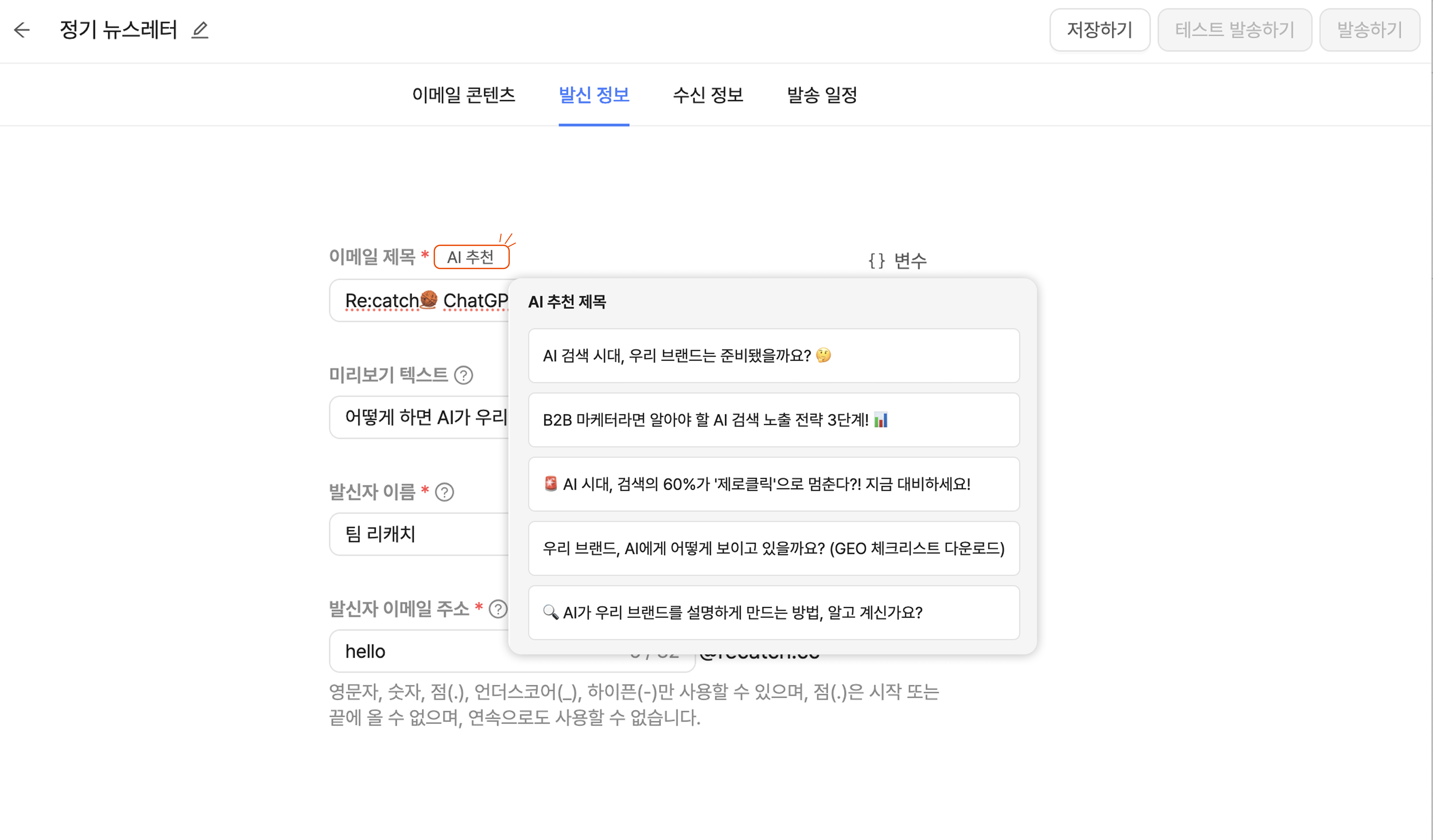 이메일 제목, 발신자 이름, 발신자 이메일 주소, 이메일 콘텐츠는 테스트 발송 전 필수 입력이 필요한 항목들입니다.