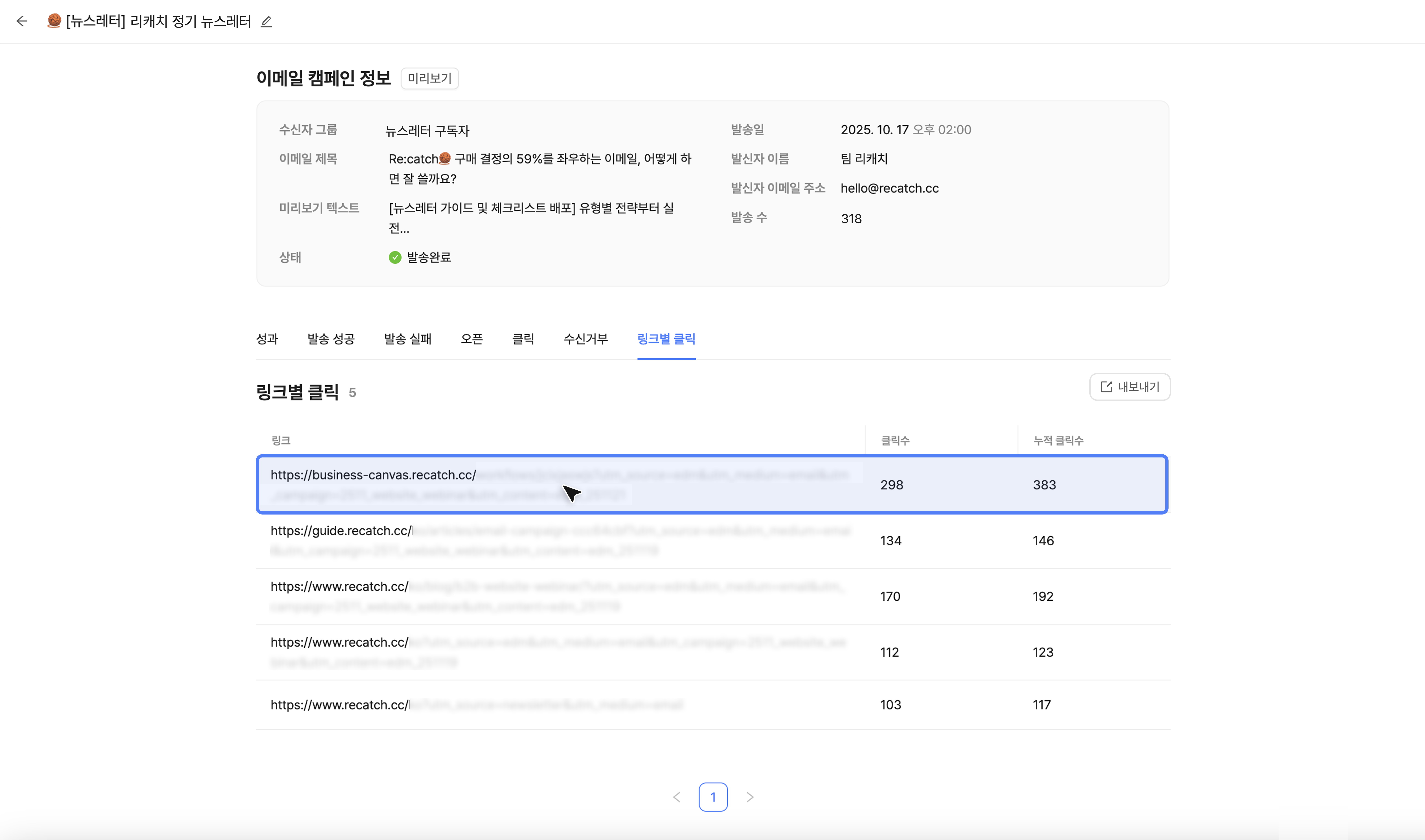 발송 결과 페이지에서는 발송한 이메일 캠페인의 정보와 성과를 확인할 수 있습니다.