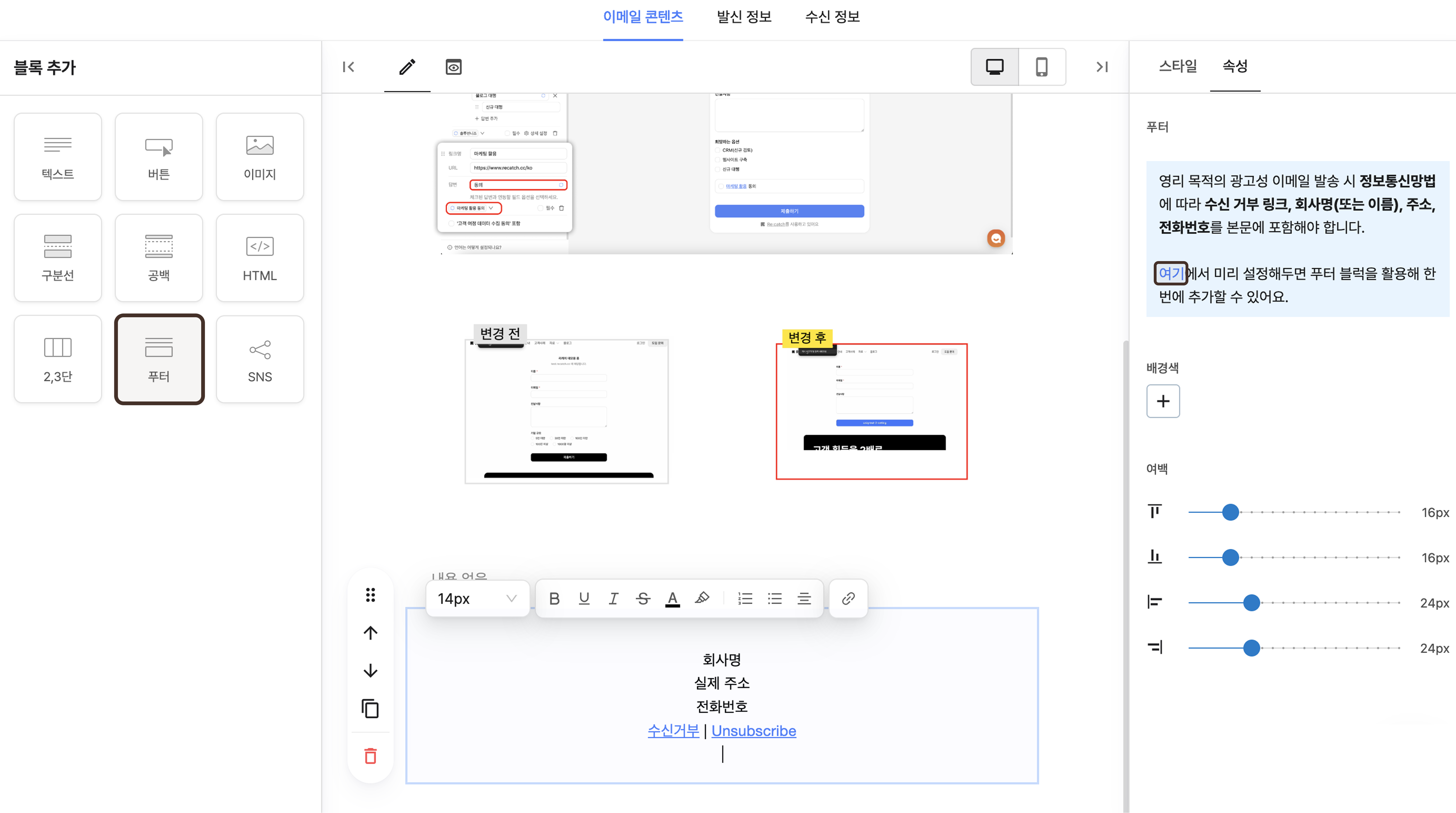 회사명, 주소, 전화번호를 사전에 설정해주시면 푸터 블록을 통해 한번에 추가가 가능합니다.