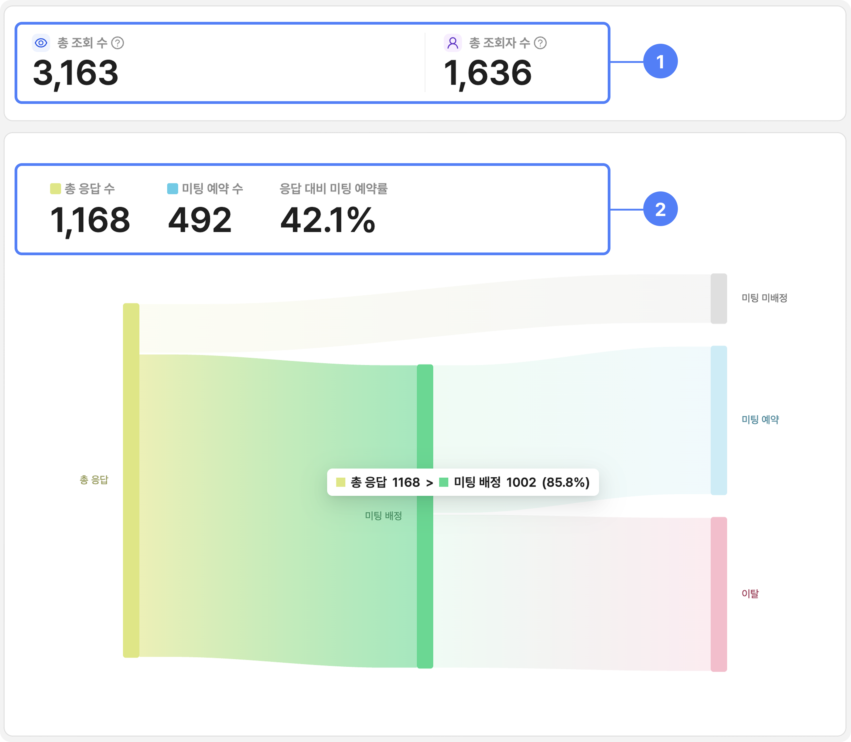 미팅이 배정된 곳에서 미팅이 얼마나 예약되었는지 각각의 전환율을 확인할 수 있어요.