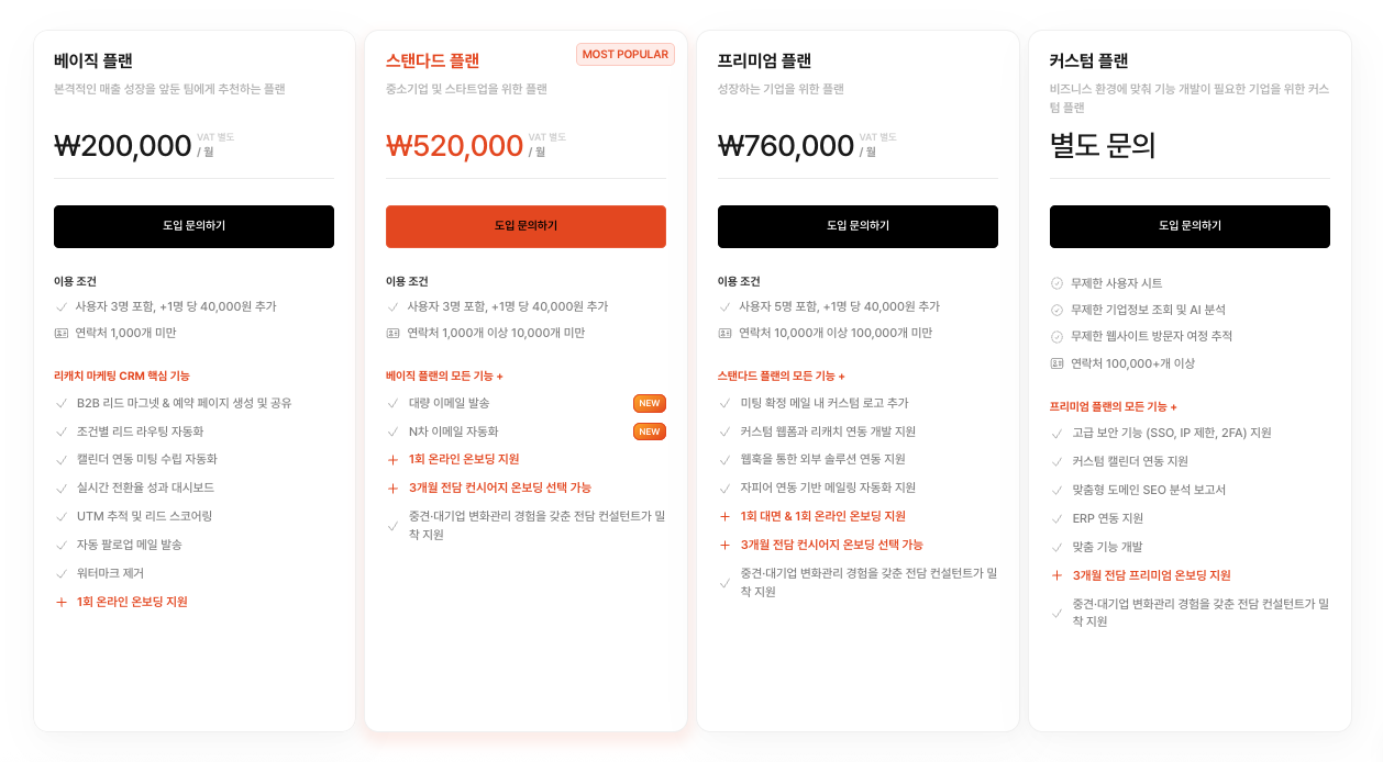 세일즈 CRM 플랜에 관한 자세한 정보는 리캐치 플랜 안내에서 각 플랜의 기능과 맞춤 안내를 확인하실 수 있습니다.
