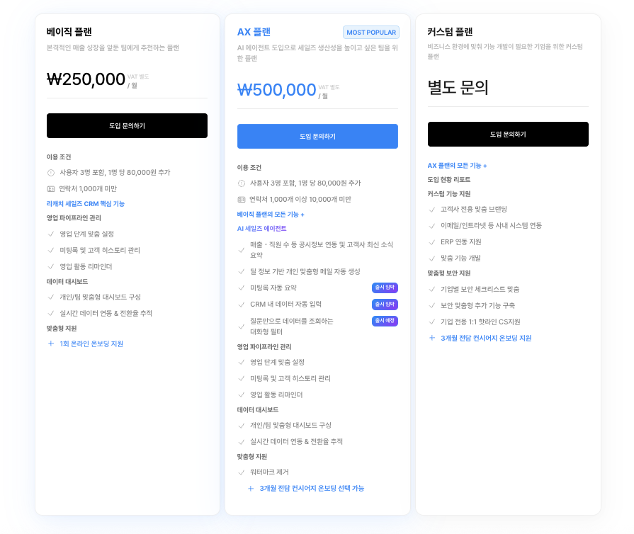 세일즈 CRM에서는 베이직 플랜, AX 플랜, 커스텀 플랜을 제공합니다.