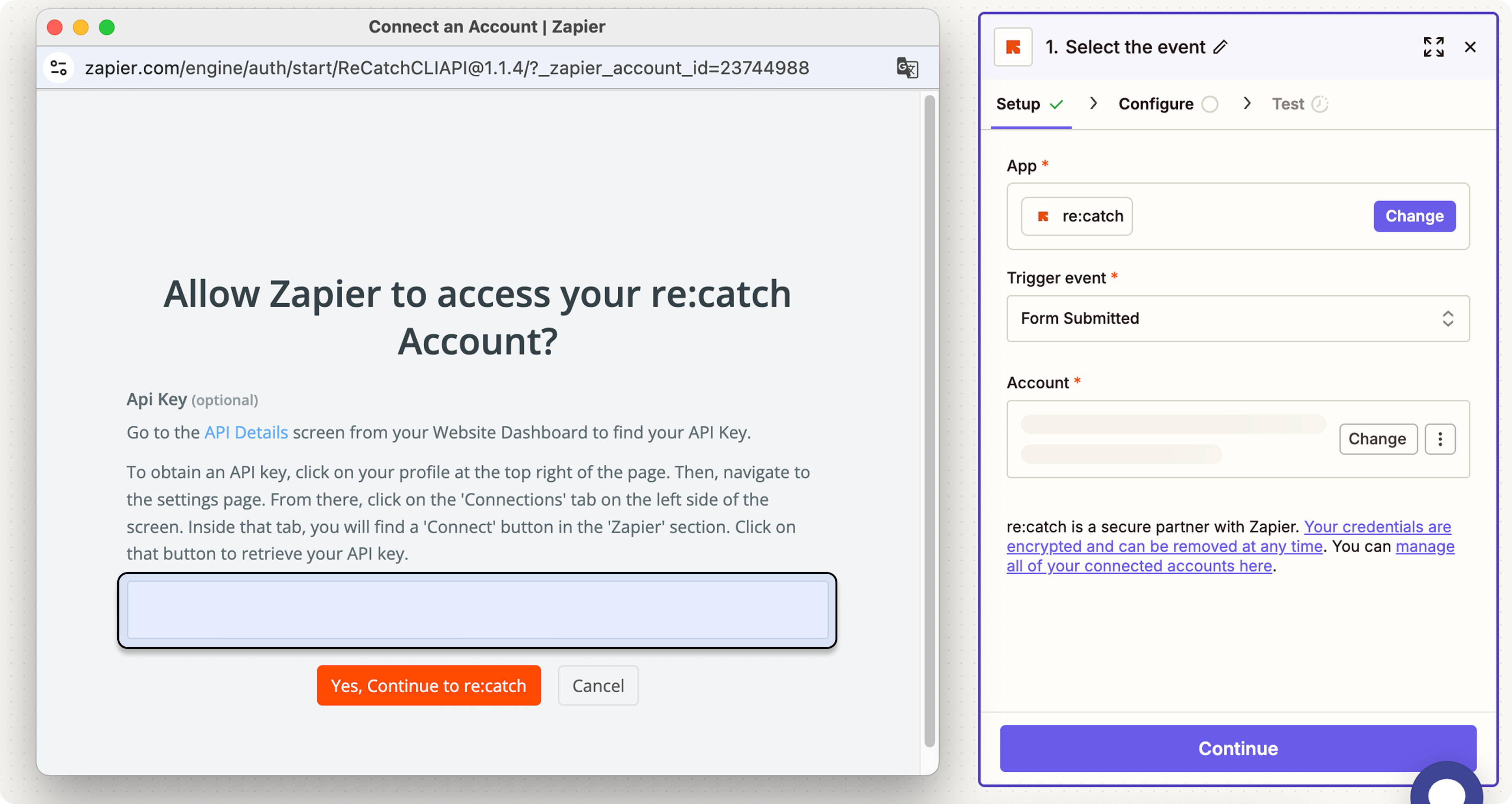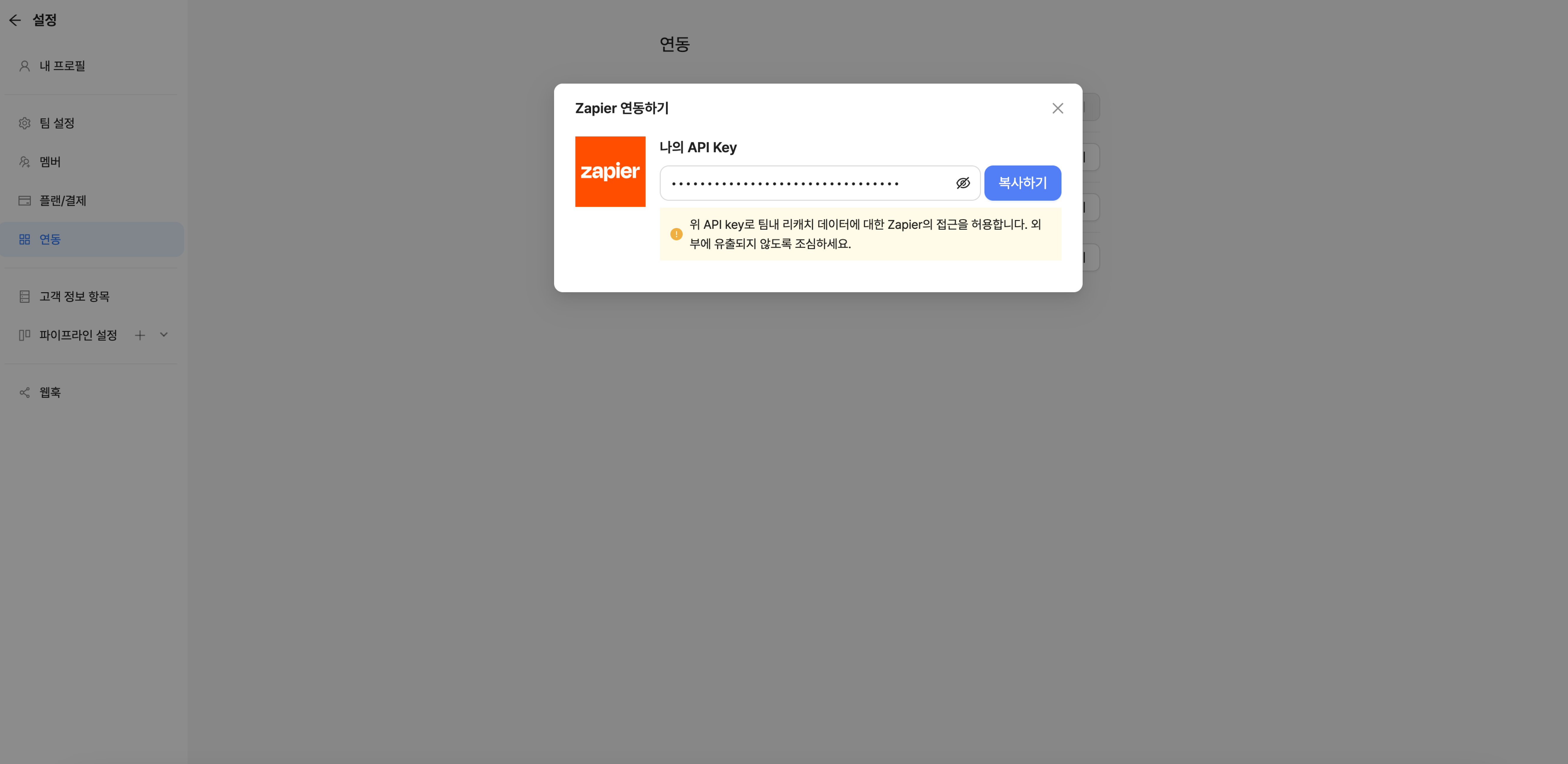 도움말: 위 API key로 팀 내 리캐치 데이터에 대한 Zapier의 접근을 허용합니다.