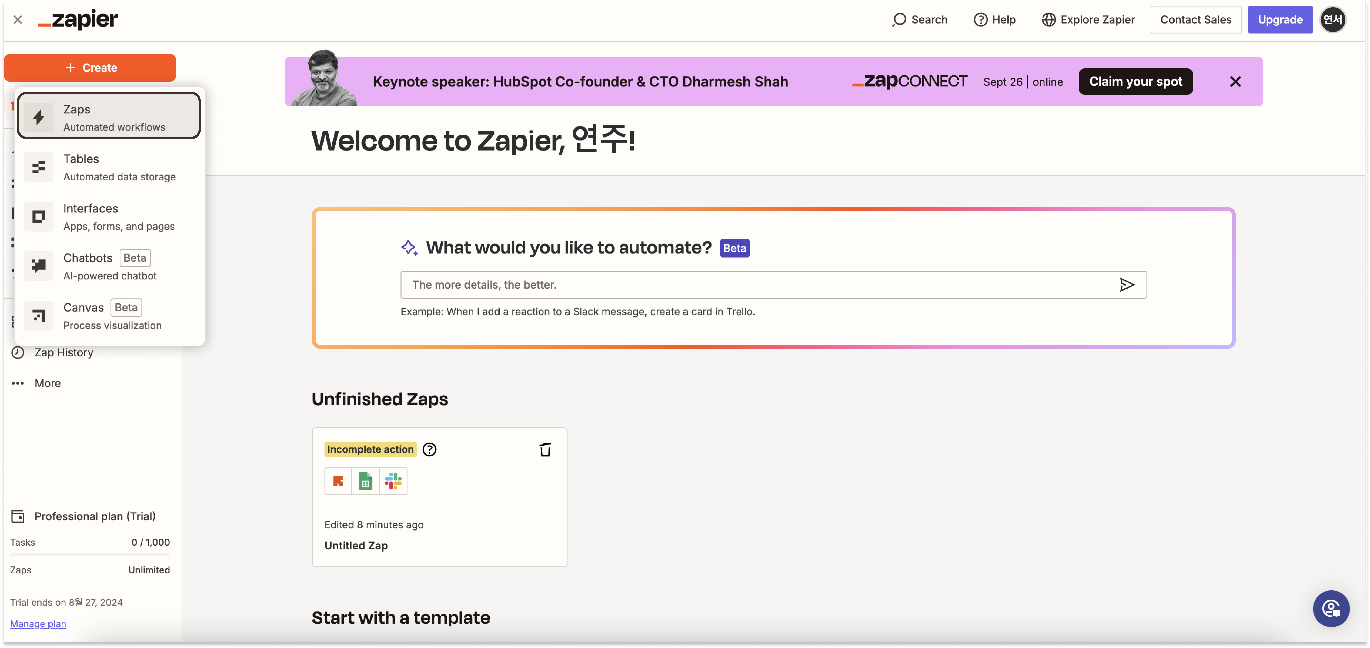 자피어 계정을 생성하신 후 좌측 상단의 ' + Create ' - ' Zaps' 를 클릭해주세요