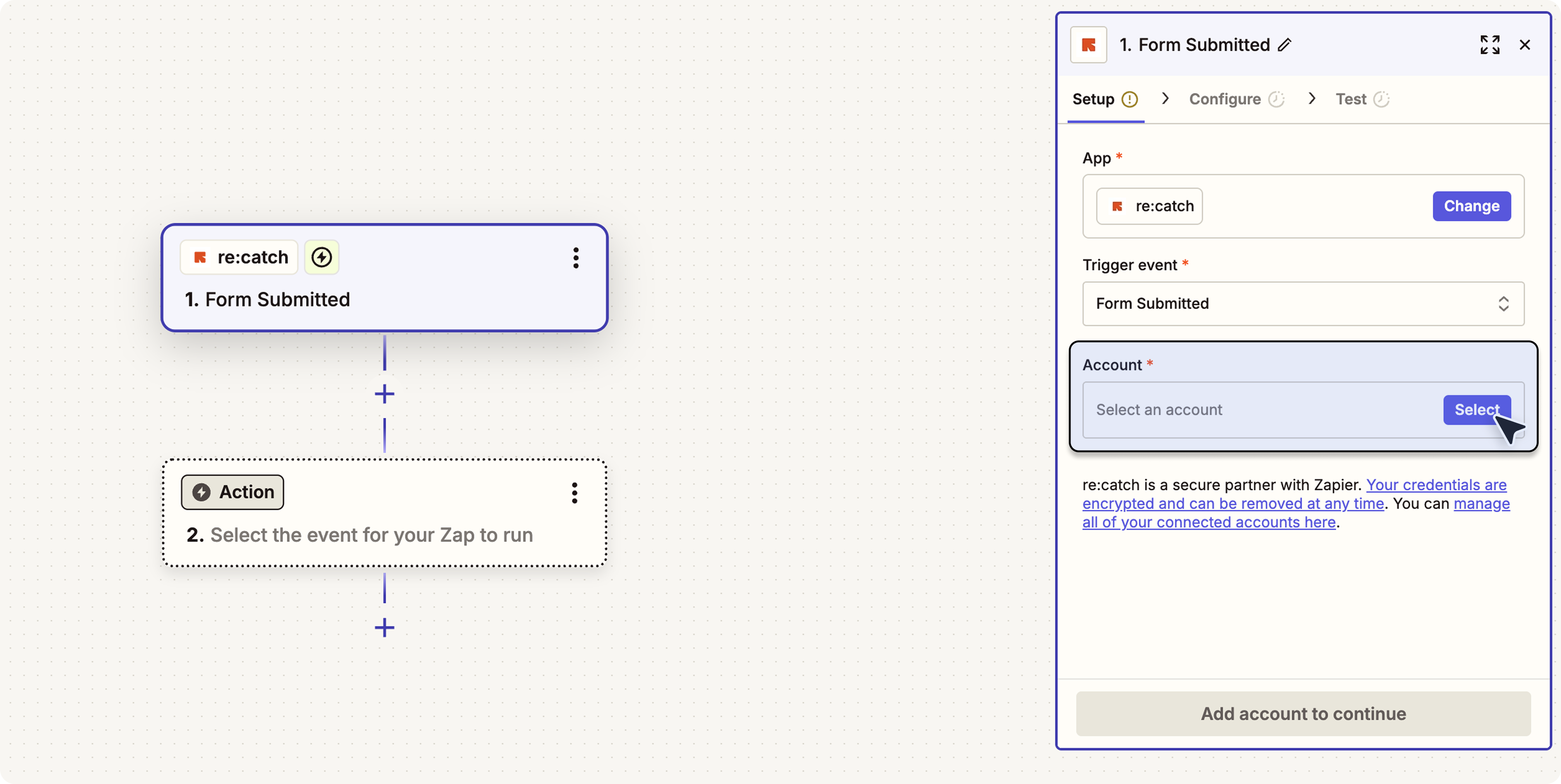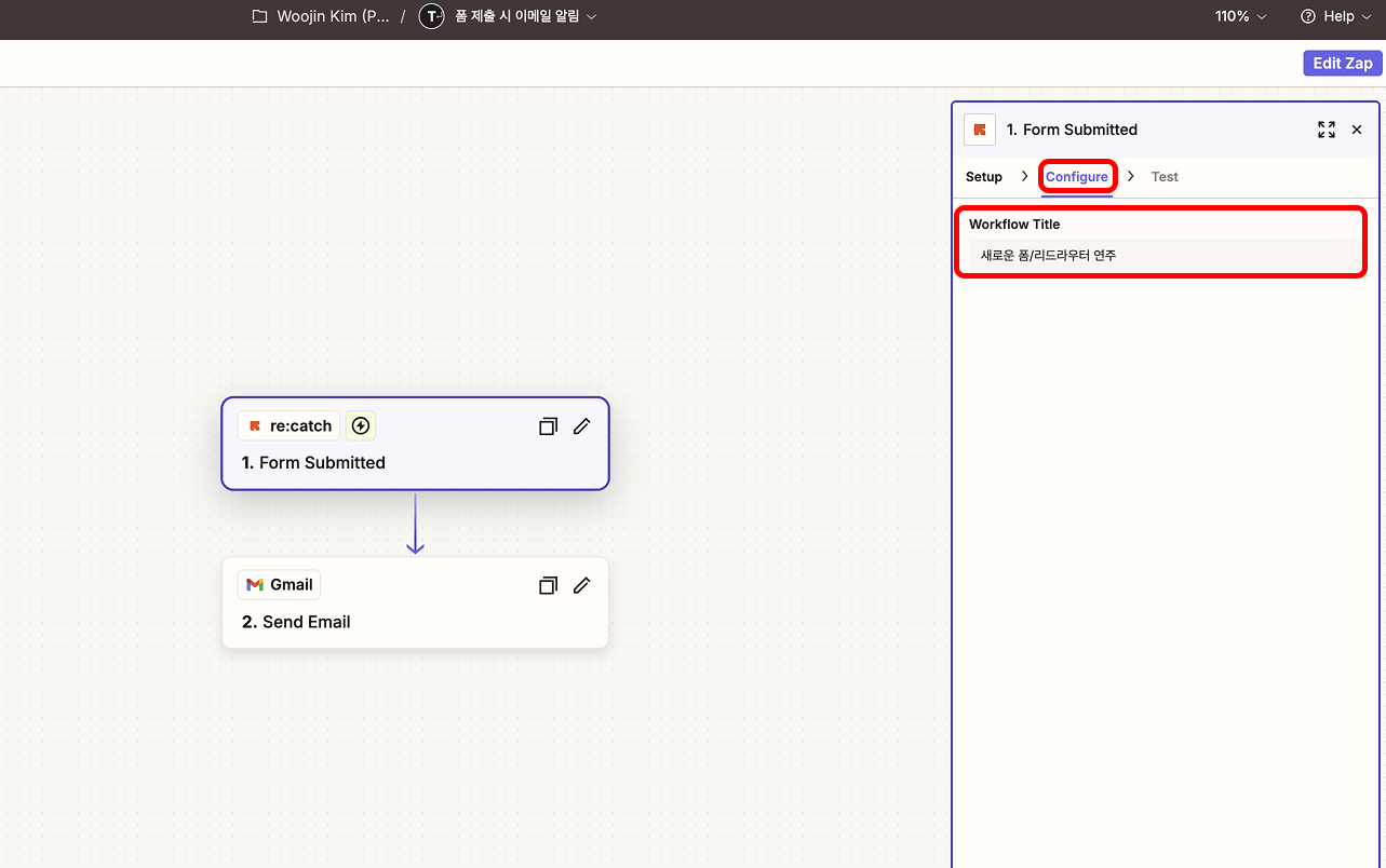 'Configure' 에서 리캐치에서 작성하신 워크플로우 제목을 선택해 주세요.