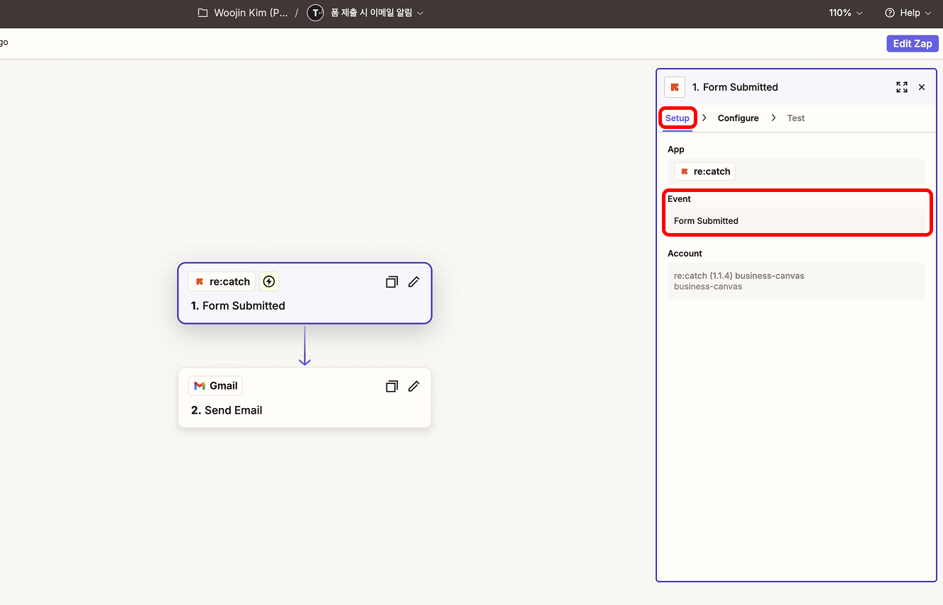 리캐치 폼을 제출하는 것이 Trigger가 되며 메일로 알림을 전송하는 것이 Action이 됩니다.