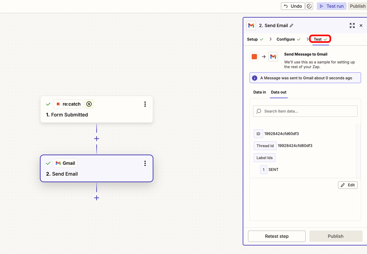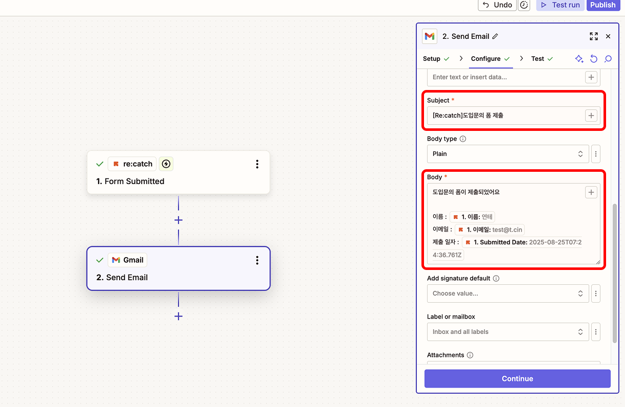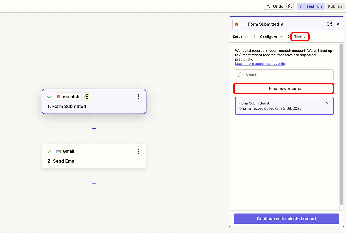 설정이 완료되었다면 'Test'단계로 이동하여 Test를 진행한 다음 Zap을 Publish해 주세요.