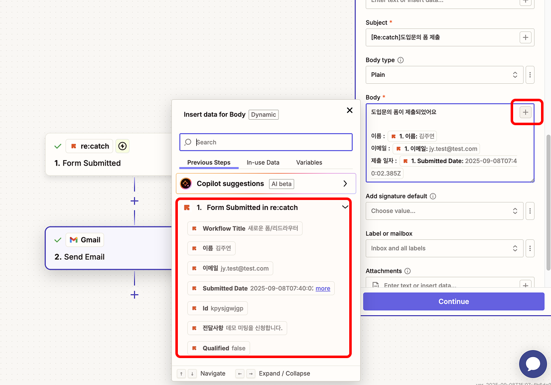 리캐치 폼을 제출한 후 폼 제출 내역을 메일로 전송하는 내용에 대해 설명합니다.