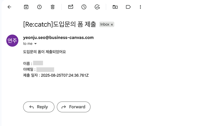 고객이 리캐치폼을 제출한 후 (미팅을 수립하지 않은 경우) 자피어나 웹훅을 통해 제출한 폼의 정보를 메일로 알림이 오도록 설정할 수 있어요.